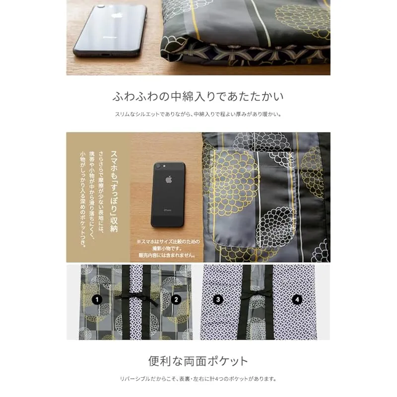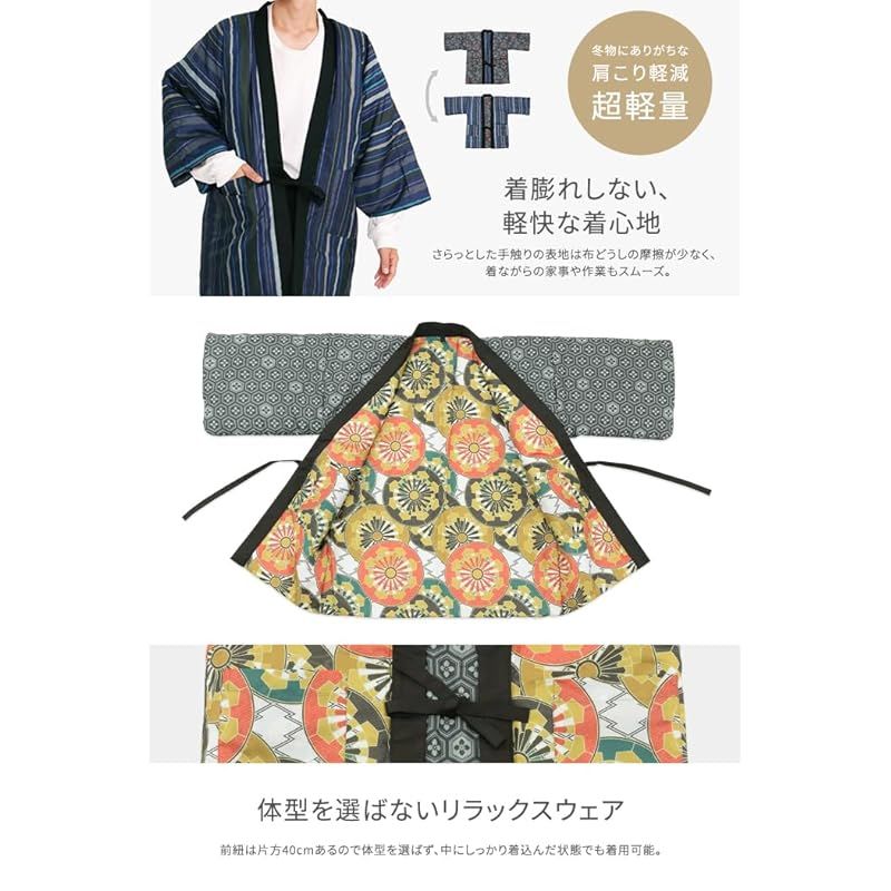 1着で2柄楽しめるリバーシブル仕様の半纏です。柄は主役級の古典柄を黒、灰、紺、紫などの定番のカラーでご用意しました。着用感も柔らかく軽量の半纏は、冬物にありがちな肩こりを軽減するため、様々な年代の方に着用していただけます。 着膨れしない薄手でスリムなシルエットながら、裾や袖の先まで中綿入りで暖かく、ゆったりとしたサイズ感なのでお家時間のお供にぴったり。前紐で着脱するため、着る人の体型を選ばず、中に着込んでも簡単に調節できます。