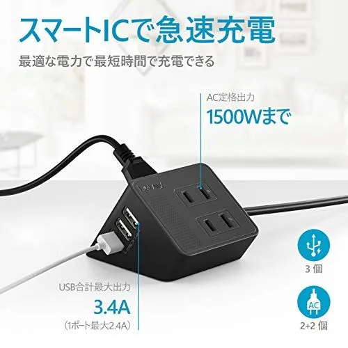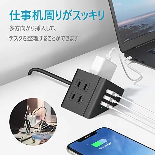 【安定性ある三角形構造】USBとACタップは各方向に分配して、コンセント同士の干渉を防ぎ、すっきりとした配線を実現できます。タップの底面に滑り止め用のゴムがより安定を提供します。AC口の出力は最大1500Wで、家庭、オフィス、会議室、パーティーなどにも大活用できます。