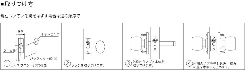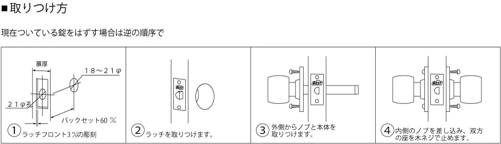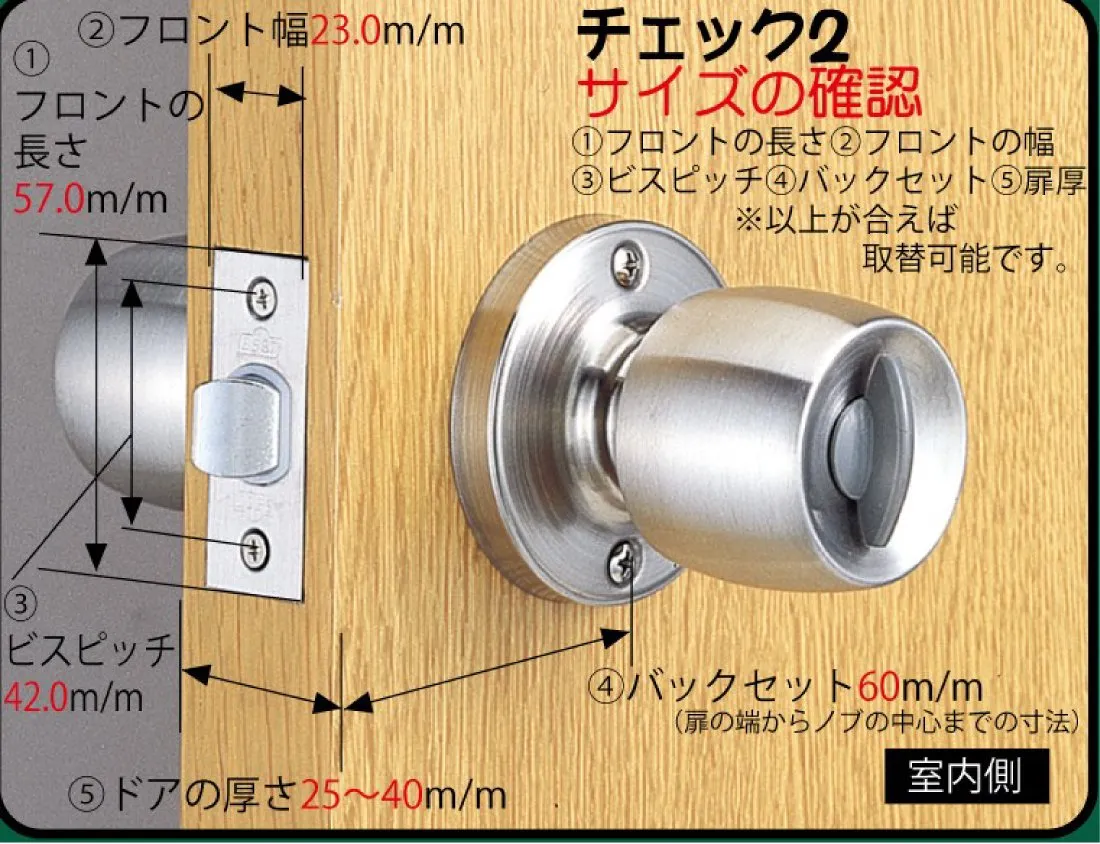 チェック2:1、フロントの長さ57ミリ 2、フロント幅23ミリ 3、ビスピッチ42ミリ 4バックセット60ミリ(扉の端からノブの中心までの寸法) 5、ドアの厚さ25~40ミリ