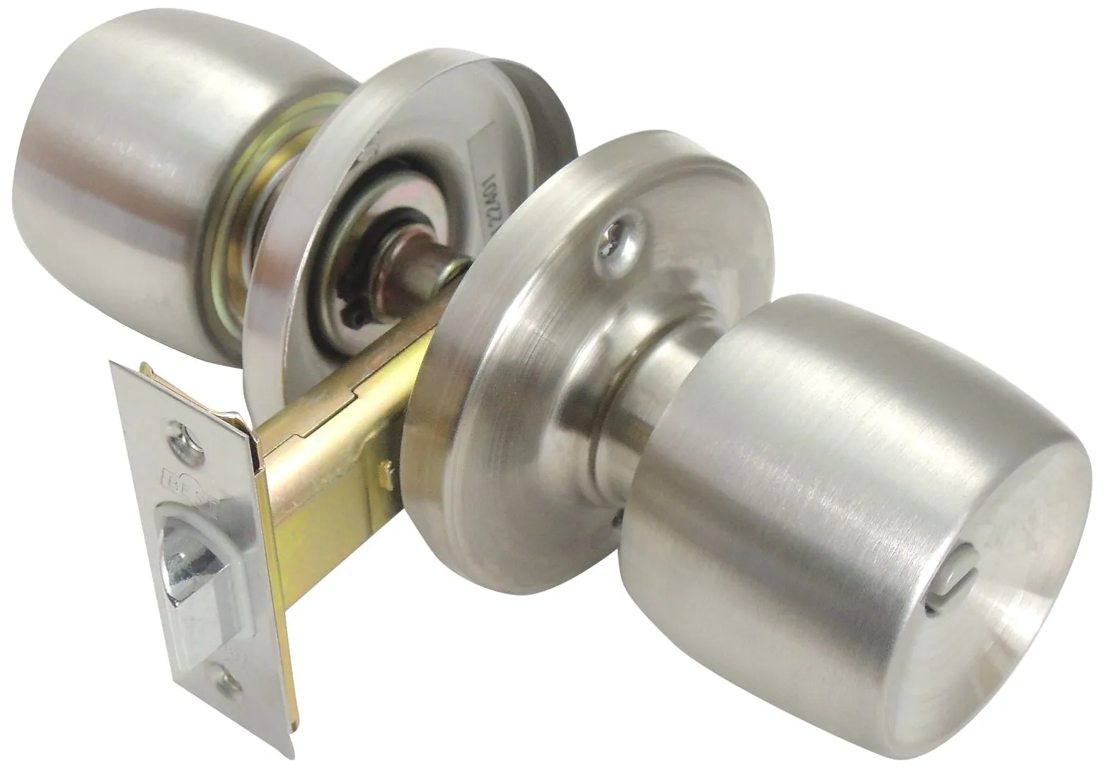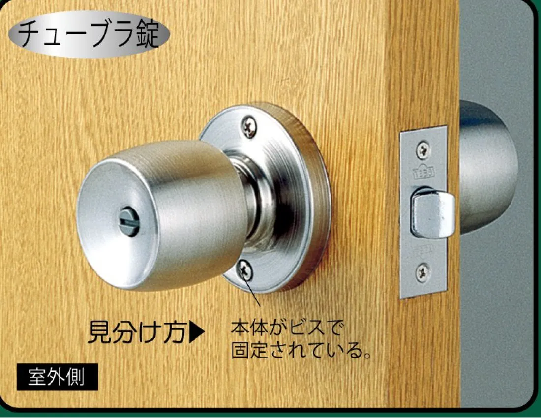 チェック1:錠前の種類がチューブラ錠(本体がビスで固定されています、ノブ又はレバーが通し芯で内外につながっています。)