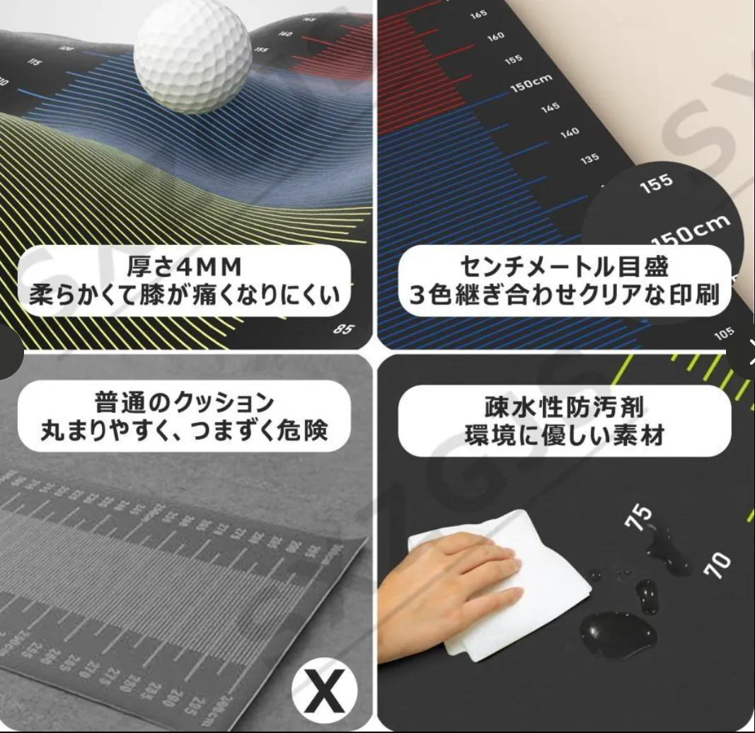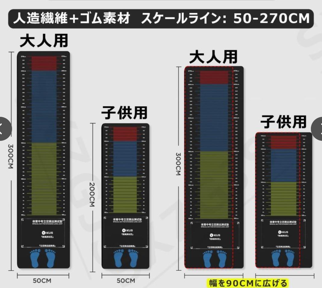 【測定範囲】練習マットには2つのサイズがあります。 測定範囲: (子供: 50-170cm、大人: 50-270cm)。 センチメートル単位で表示される目盛により、脚力を正確に測定できます。