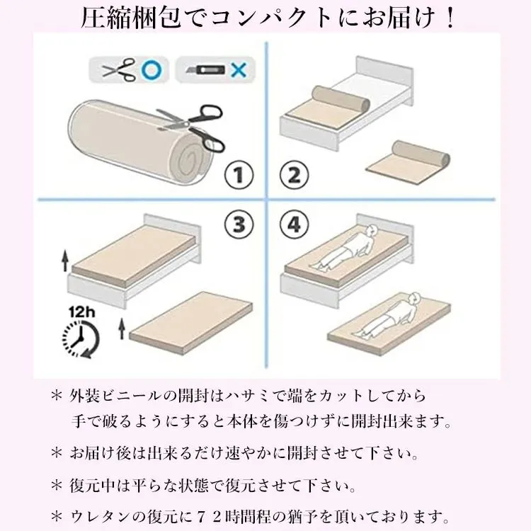 ・開封直後は、ウレタンフォームが非常に柔らかく使用に適しません。最低でも開封してから約24時間経過後に使用願います。約72時間程度で本来の厚み、硬さまで回復します。