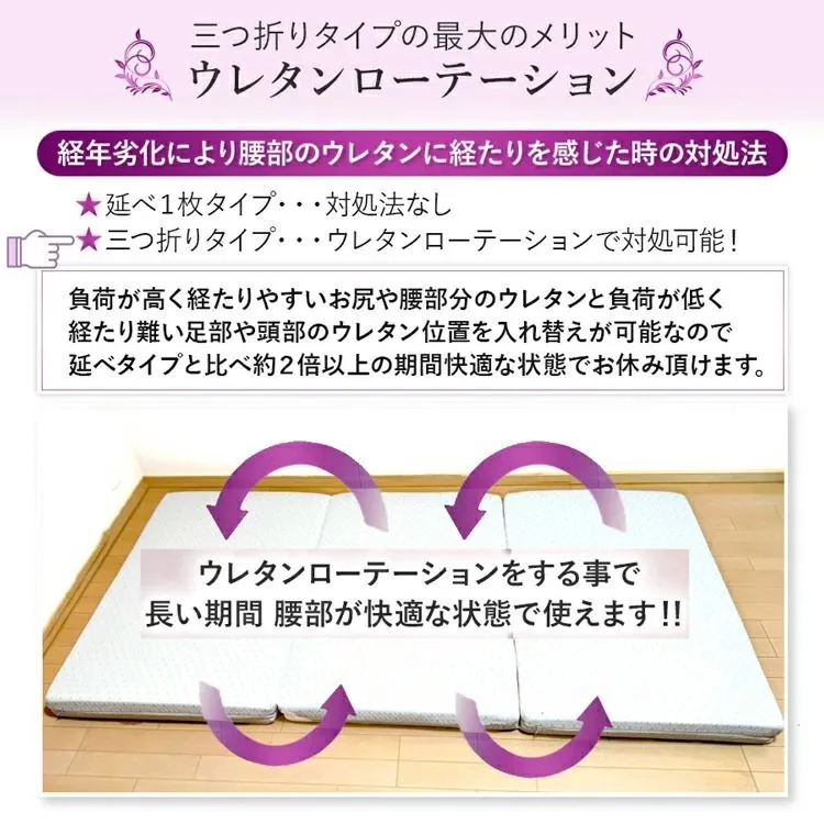こちらはコンパクトにたためる三つ折りタイプです。3つ折りの特徴である頭・腰・足の各々のブロック(芯材)をローテーションする事が出来ます。