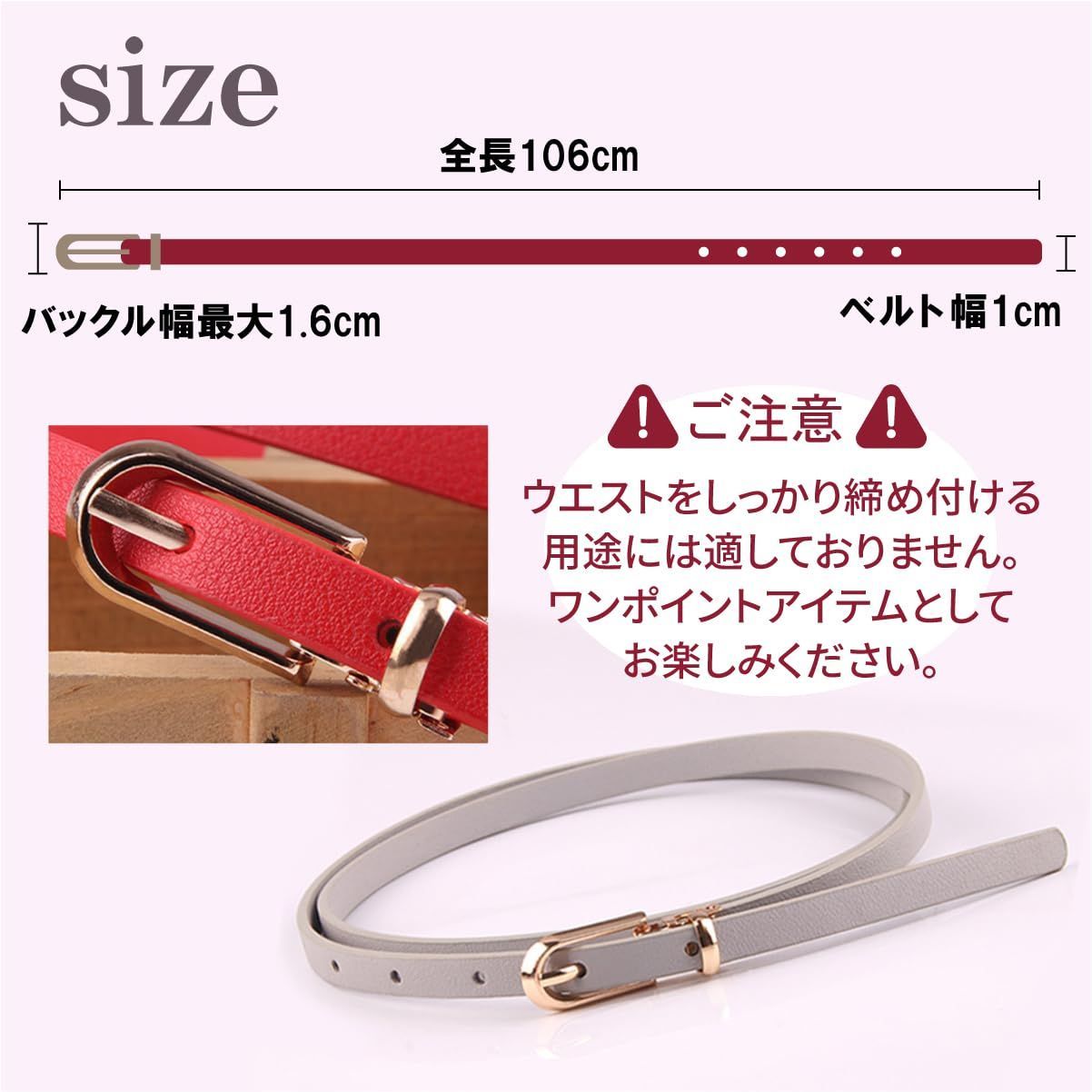ご覧いただきありがとうございます。 当店では他サイトにも商品を販売しているため まれに売り切れや取り寄せ中となる場合があります。 また、お客様都合でのキャンセル依頼はお受けできかねます。 ご購入頂きましたら発送システムがスタート致しますので、ご了承頂き、購入手続きの方をお願いいたします。 基本的にはスピード配送になりますが、商品によっては、お時間を要するものもありますので、その際はご購入後にお知らせさせて頂いております。よろしくお願いいたします。 [KASSAI] ワンポイントベルト 細ベルト 全長106cm 幅1cm(10mm) カットでサイズ調整可能 レディース 婦人 カジュアル ビジネス 日本国内検品 全長約106cm ベルト幅1cm バックル部最大幅1.6cm (ウエスト目安94cmまで)カットでサイズ調整可能 バックルカラー:ゴールド(金メッキ) 材質:PU合成皮革 / 合金 ウエストをしっかり締め付ける用途には適していません。ワンポイントアイテムとしてお楽しみください。 ・色落ち、色移りの原因となりますので他の繊維等との摩擦にご注意ください。また汗や雨などの水気を避け、湿った場合は乾いた布で拭いて直射日光を避け風通しのいい場所で干して下さい 中国製 最後までご確認頂き誠にありがとうございました。 ご確認頂き、ご購入いただけましたら幸いです。 何かご不明点などがございましたらお気軽にメッセージからお問い合わせ下さい。
