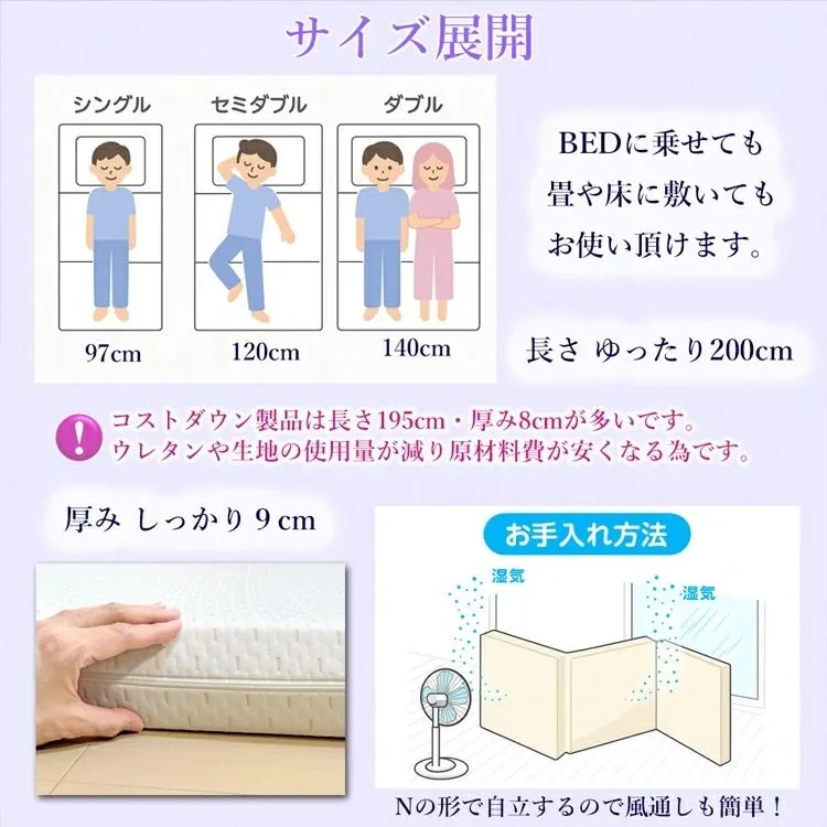 ベッドフレームの上や、敷布団としてフローリングや畳の上に敷いてお使いいただけます。