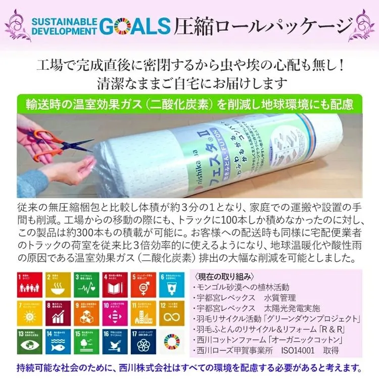 ・開封後、本来の厚みに回復するまでは、上に重いものを載せず広げた状態にしておくことをお勧めします。すぐに折りたたんだり、重いものを載せたりした場合、復元の妨げになり、回復するまでに時間がかかることがあります。