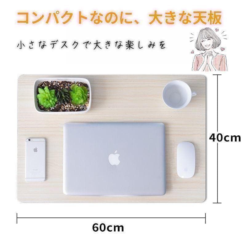 【商品詳細】幅約60cm×奥行約40cmの広々天板で、ノートPC・書類・コーヒーカップまで余裕をもって配置可能。