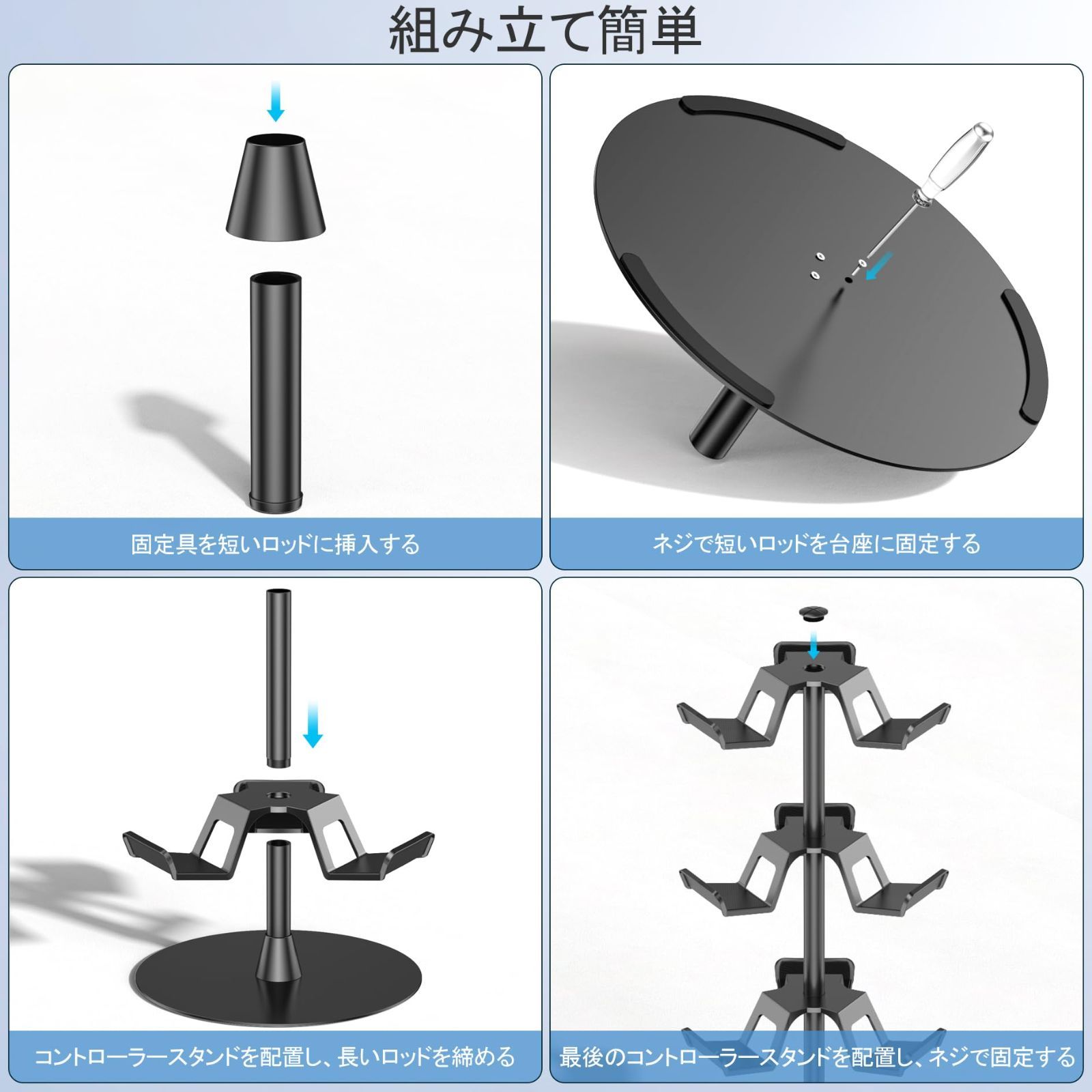 【高さを自由に調整可能】コントローラーホルダーは3層構造になっており、位置は固定ですが、高さが自由に調整できます。用途に合わせてヘッドセットスタンドを1層(高さ約19.2cm)/2層(高さ約22.5cm)/3層(高さ約33.5cm)を組み立て使用することができます。