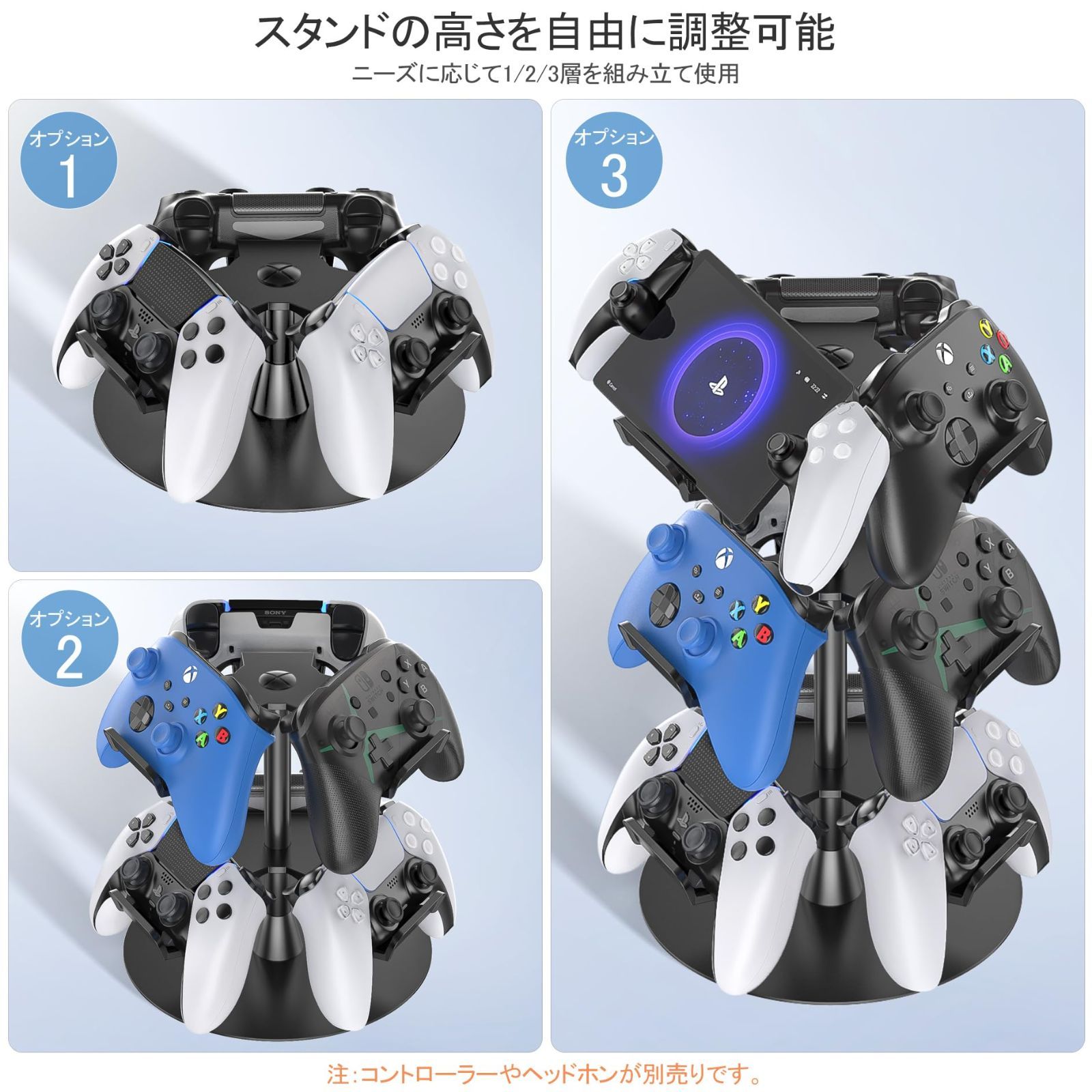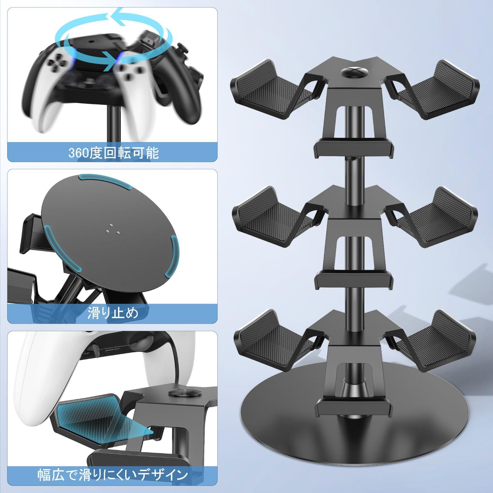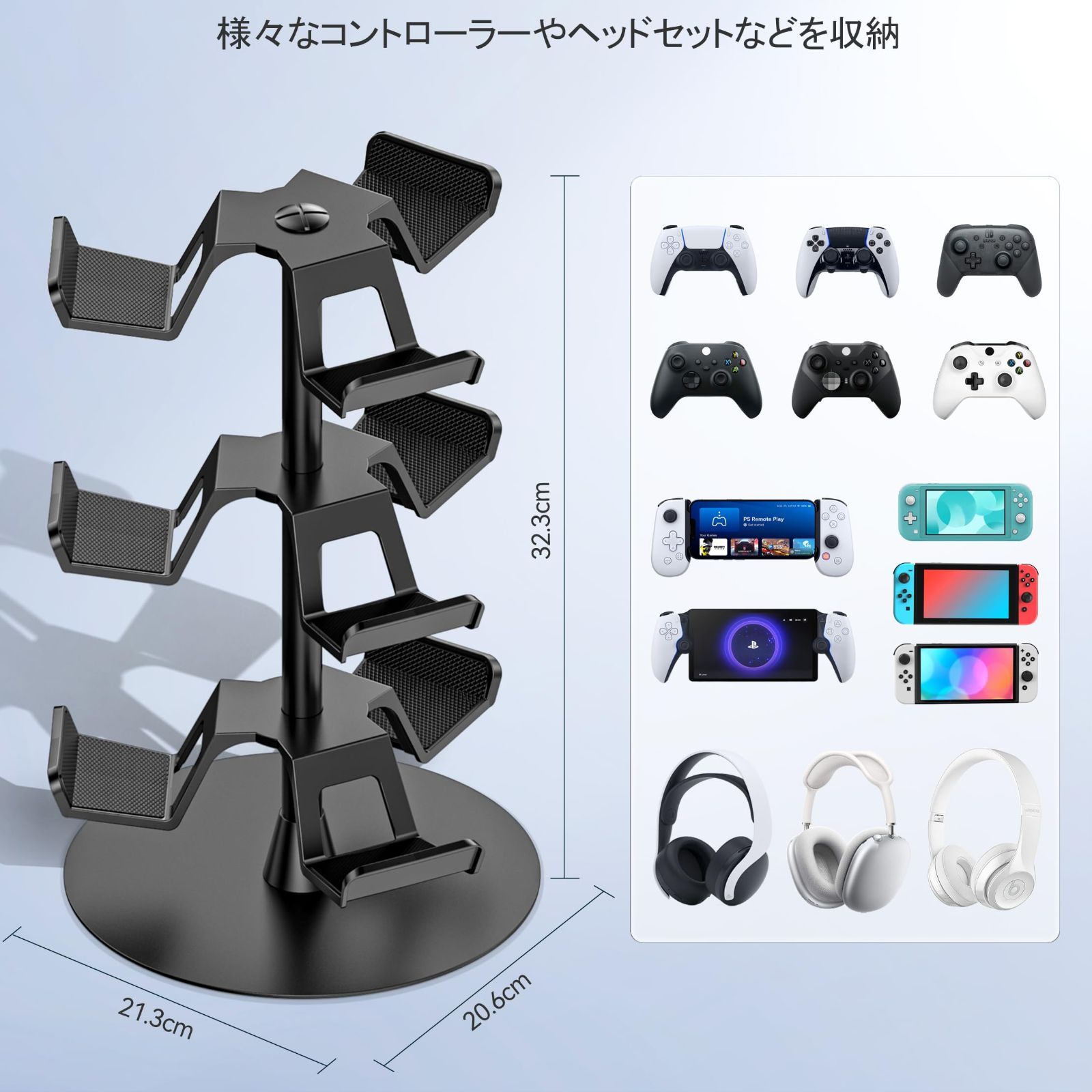 コントローラー スタンド 3層対称設計 9つまで縦に収納 ゲームコントローラー 収納ラック 卓上 ヘッドホンスタンド 360度回転式 ヘッドセット ホルダー 組み立て簡単 頑丈で安定 省スペース 整理整頓 幅広くコントローラーに対応 ブラック