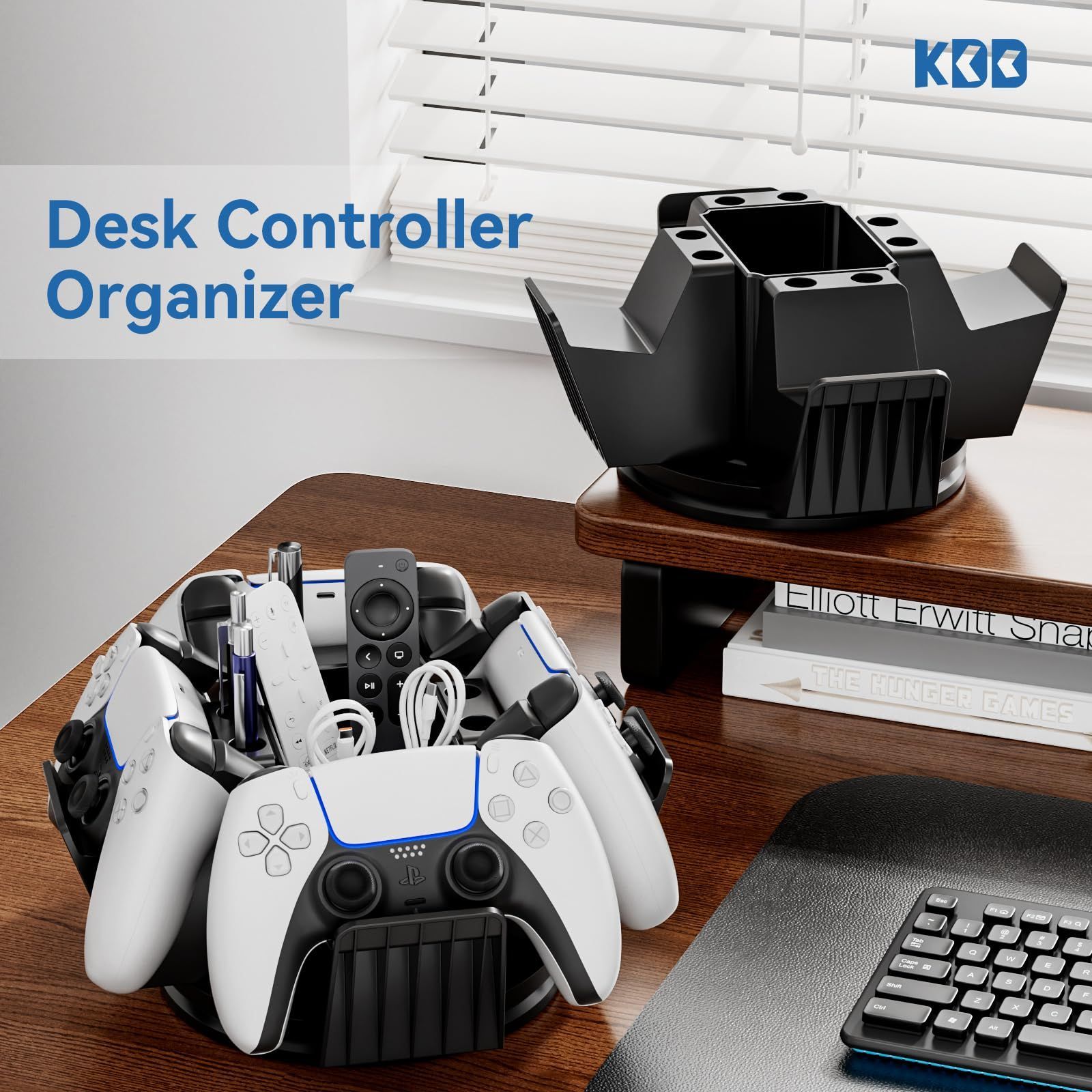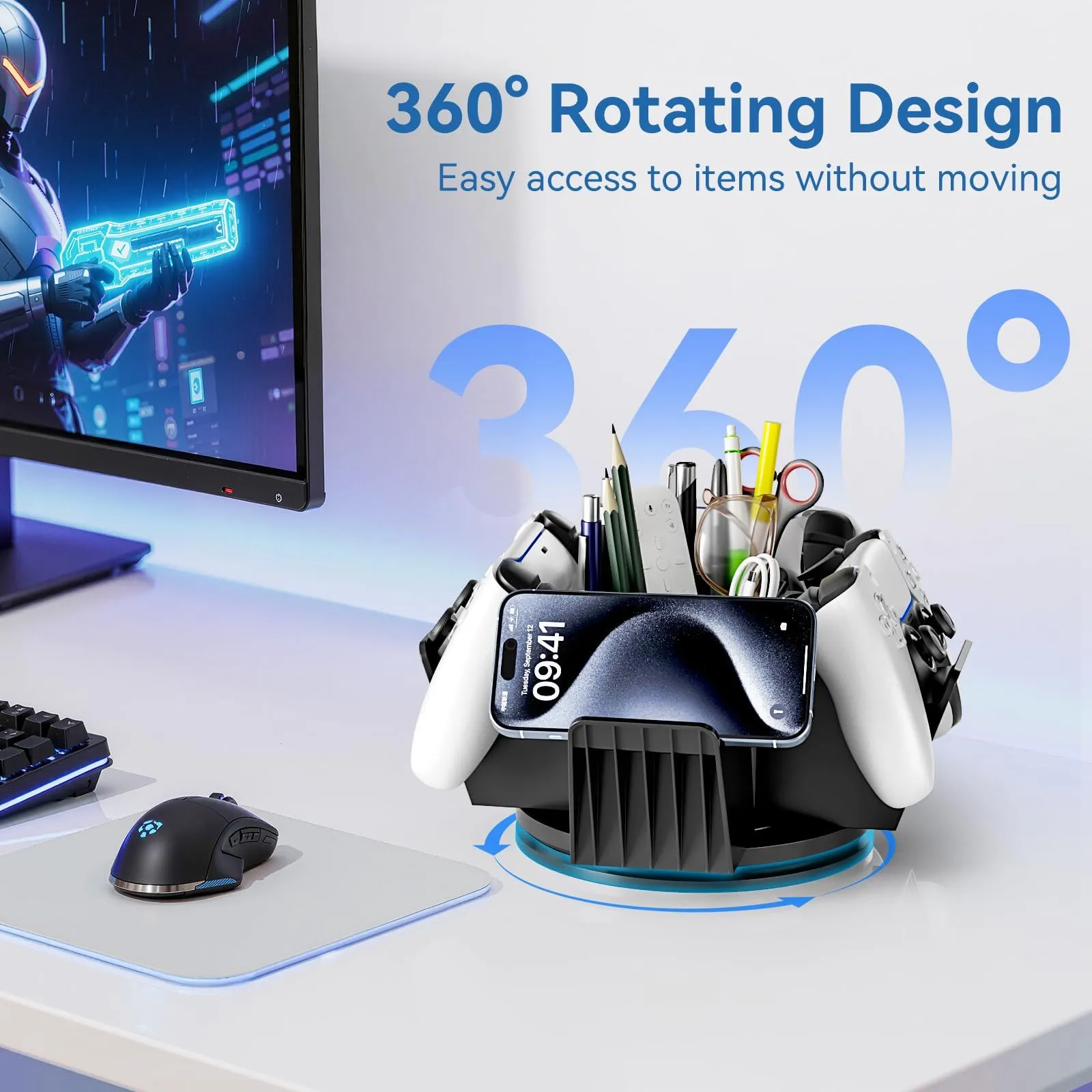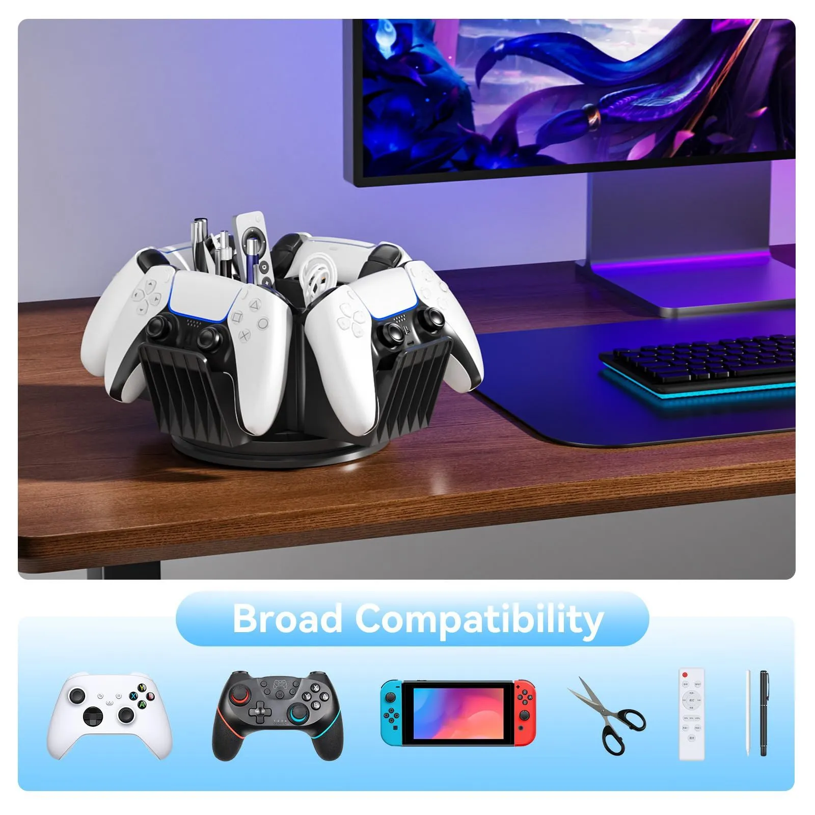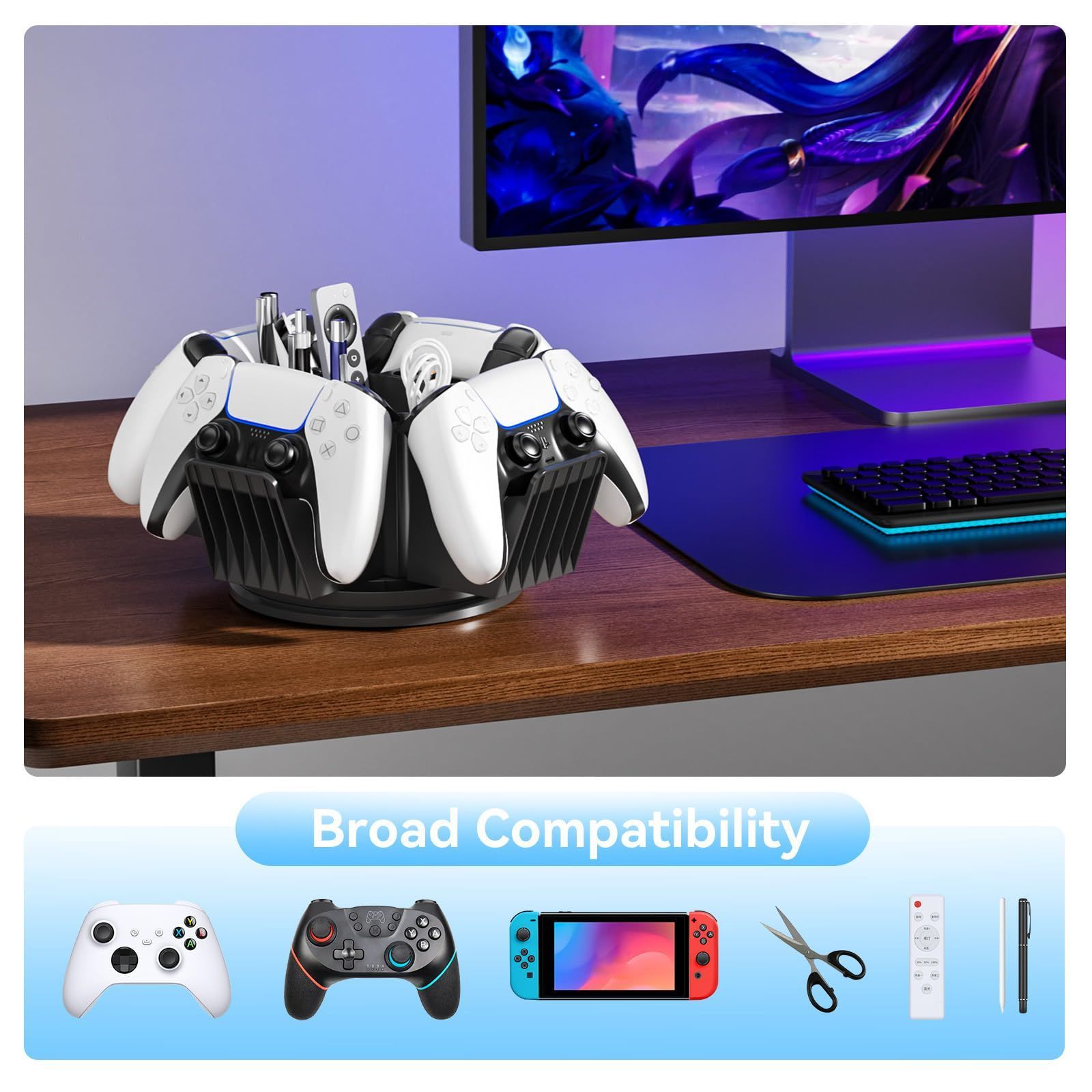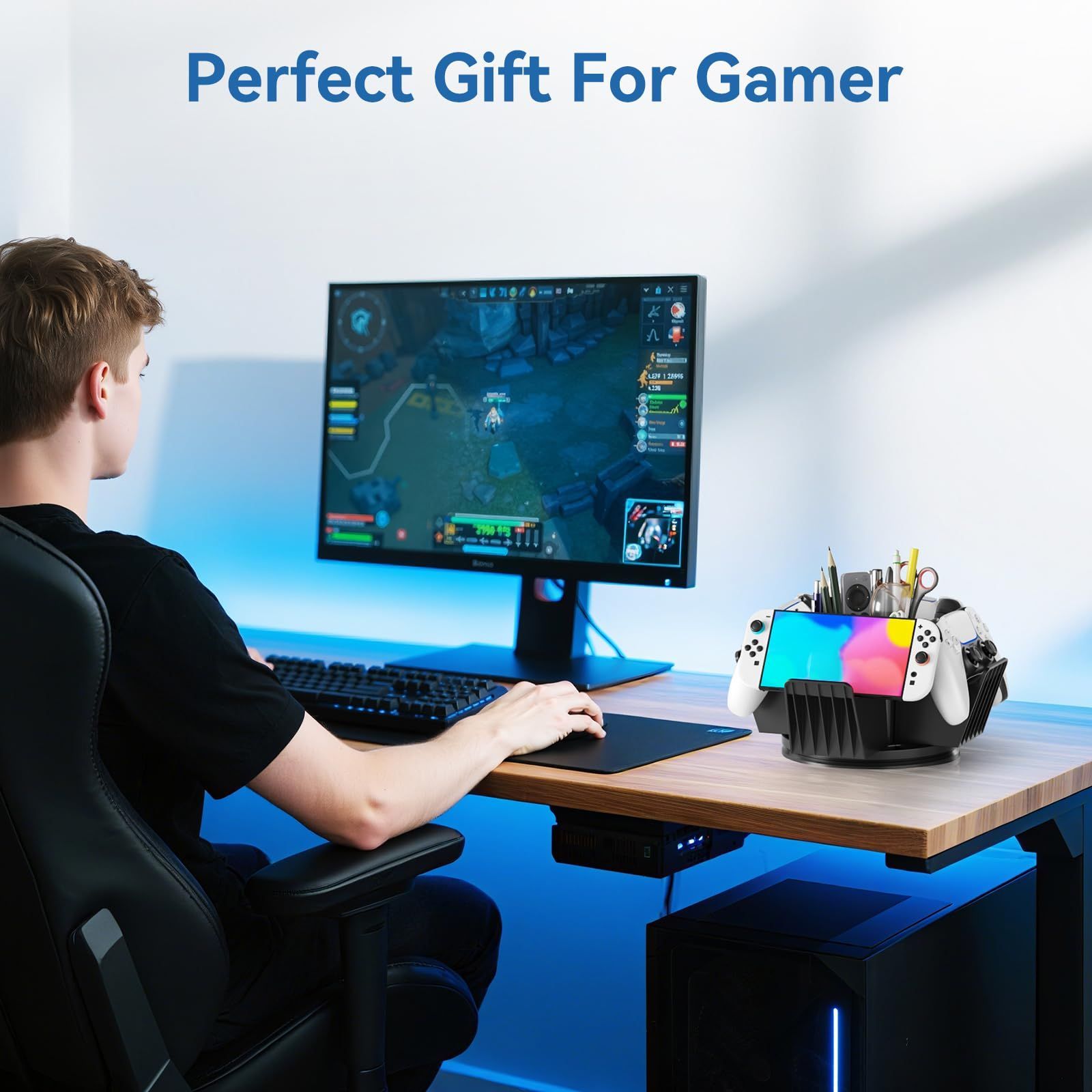 3-in-1収納機能 - このデスクオーガナイザーは多機能で、4つのコントローラーラック、6つのペン立て、1つの収納ボックスを備えています。コントローラー、スタイラスペン、リモコン、その他のゲーマー向けアクセサリーを収納でき、デスクを整理整頓するのに役立ちます。