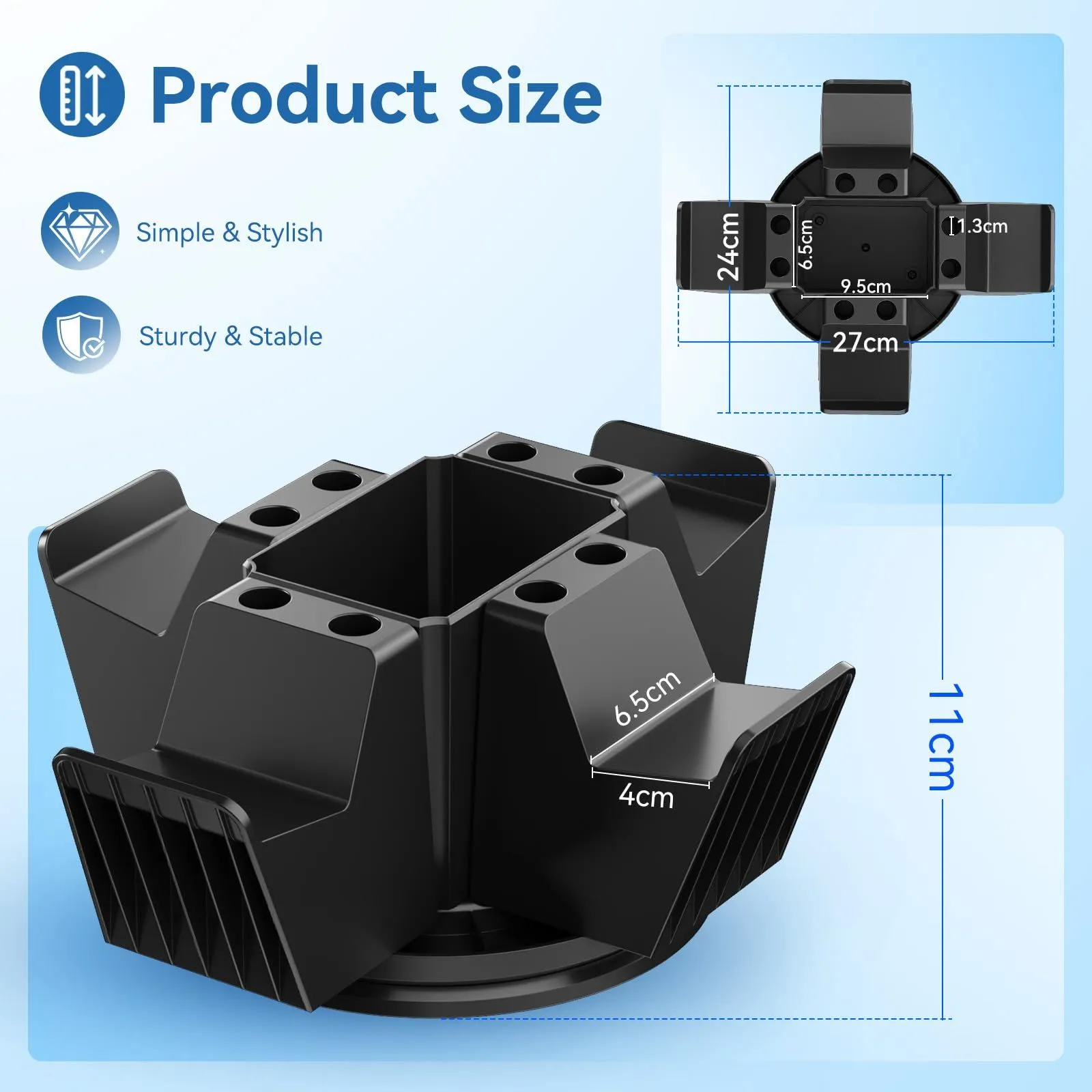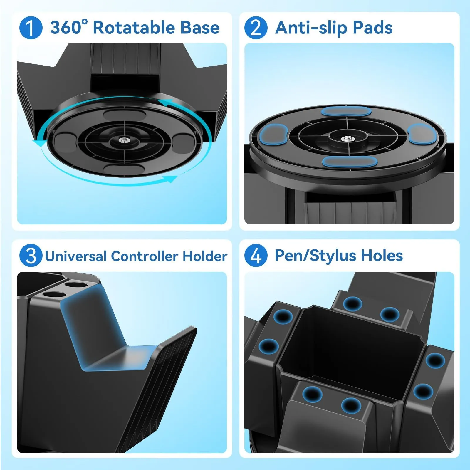 安定性と滑り止め - 当社の回転式コントローラースタンドのベースには、4つの滑り止めパッドが装備されています。これらのパッドはデスクトップとの摩擦を効果的に高め、オーガナイザーを安定させ、動きによるコントローラーやアクセサリの落下を防ぎます。