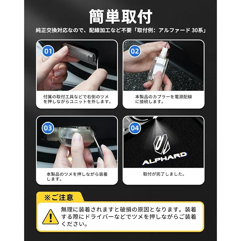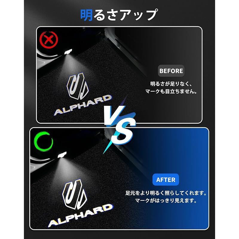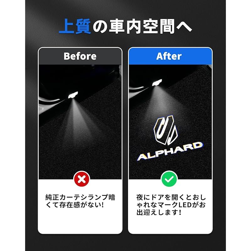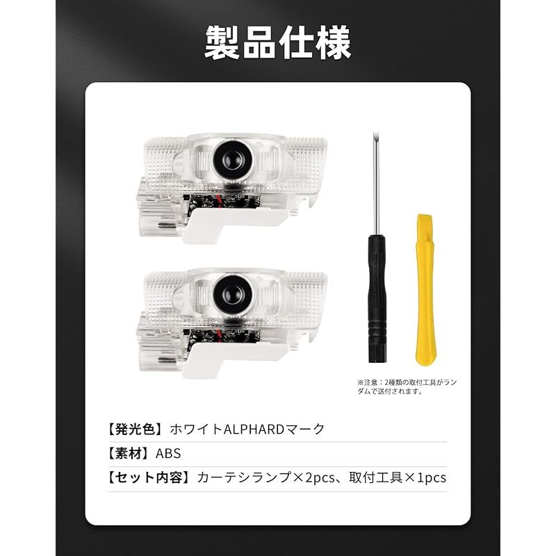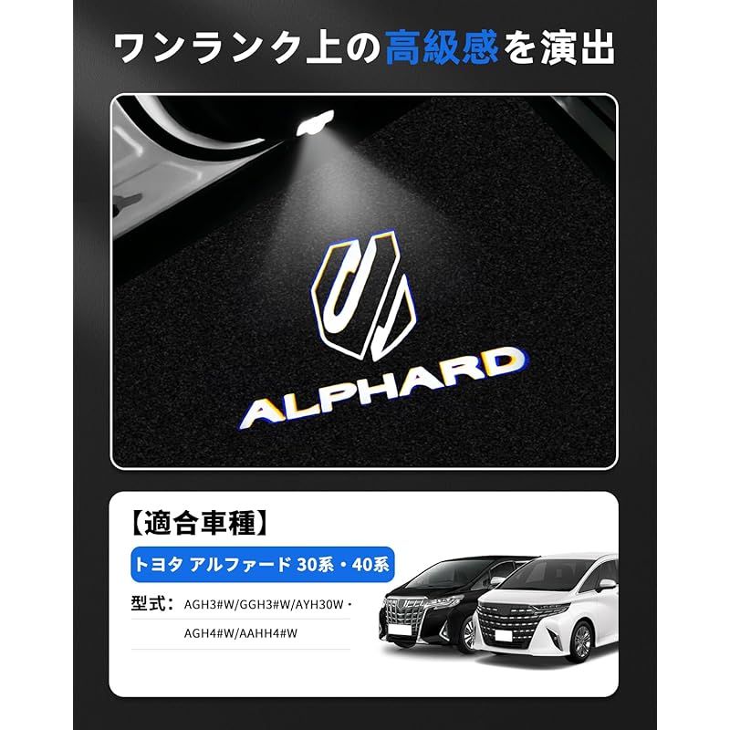 【適合車種】トヨタ アルファード ALPHARD 30系; 型式:AYH/GGH/AGH30・35W 年式:H27.1~; トヨタ アルファード ALPHARD 40系; 型式:AGH4#W/AAHH4#W;年式:2023年6月~現行;セット内容:カーテシランプ×2pcs、取付工具×1pcs。