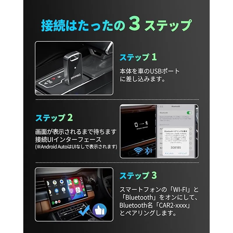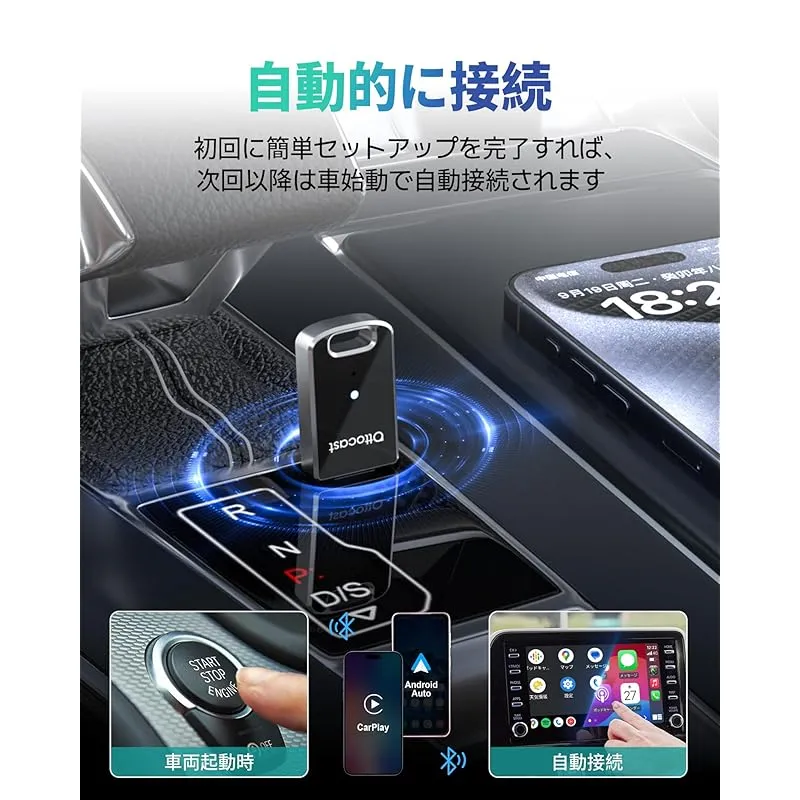 【接続簡単】面倒な接続は一切必要ありません。お使いの車両が有線CarPlay/Android Autoをサポートしていれば、挿すだけで接続が完了します。スマートフォンとBluetoothで接続するだけの簡単設定で、初回設定さえすれば以降はスマートフォンがポケットの中に入っていても自動的にCarPlay/Android Autoがディスプレイオーディオに表示されます。簡単接続により、手軽にアップグレードも可能、快適なカーライフをお楽しみください。