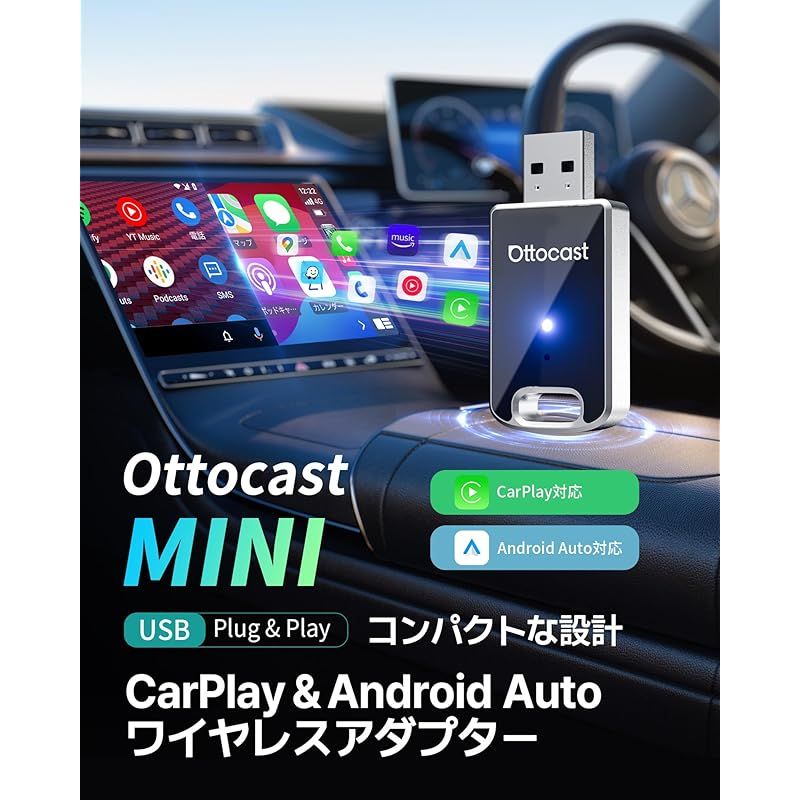 【公式】オットキャスト MINI Ottocast 新型ミニCarPlay Android Auto ワイヤレスUSBカーアダプター 2025最新 アンドロイドオート&カープレイ無線化接続 レシーバ 純正有線CarPlay/Android Auto搭載車適合
