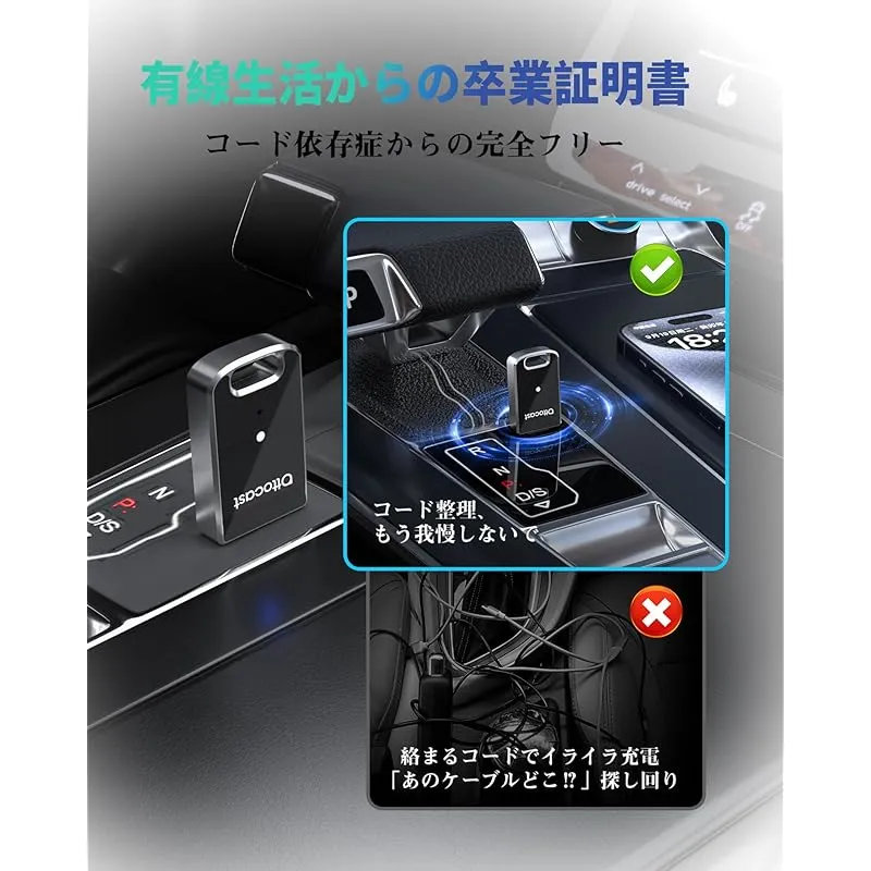 【コンパクト設計】このUSBワイヤレスカーアダプターはUSBメモリのような小さいボディサイズのため、場所を取らず運転の邪魔になりません。また、L型のType A to AアダプターとI型のType-C to Cアダプターが同梱されます。車の接続はタイプCな場合でも、USB変換して接続でき、心配はいらないです。