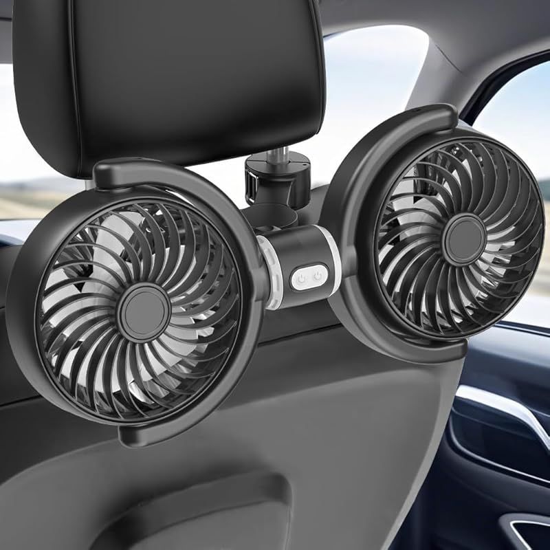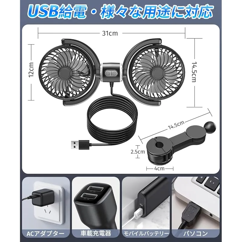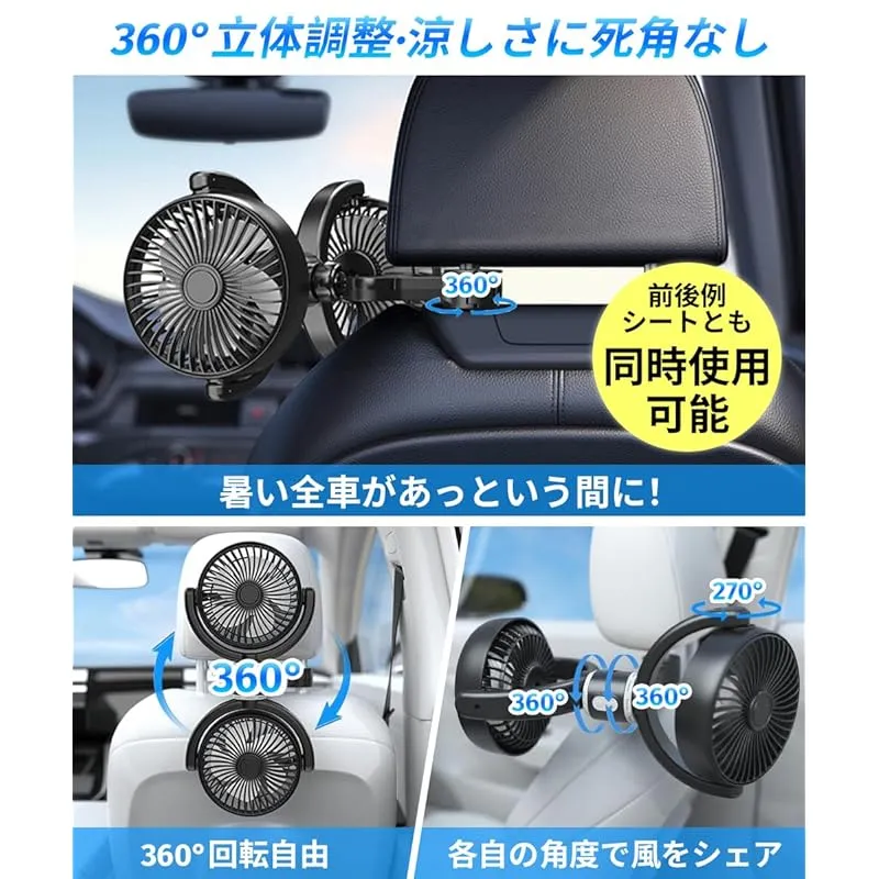 【2025夏初デビュー USB給電】車載扇風機 後部座席用 双頭車載ファン 独立制御 3段階風量 360°角度調整可能 低騒音 ヘッドレストファン 後部座席に送風 車用ファン 空気循環 取付簡単 夏対策 熱中症対策 取付簡単 日本語説明書付き