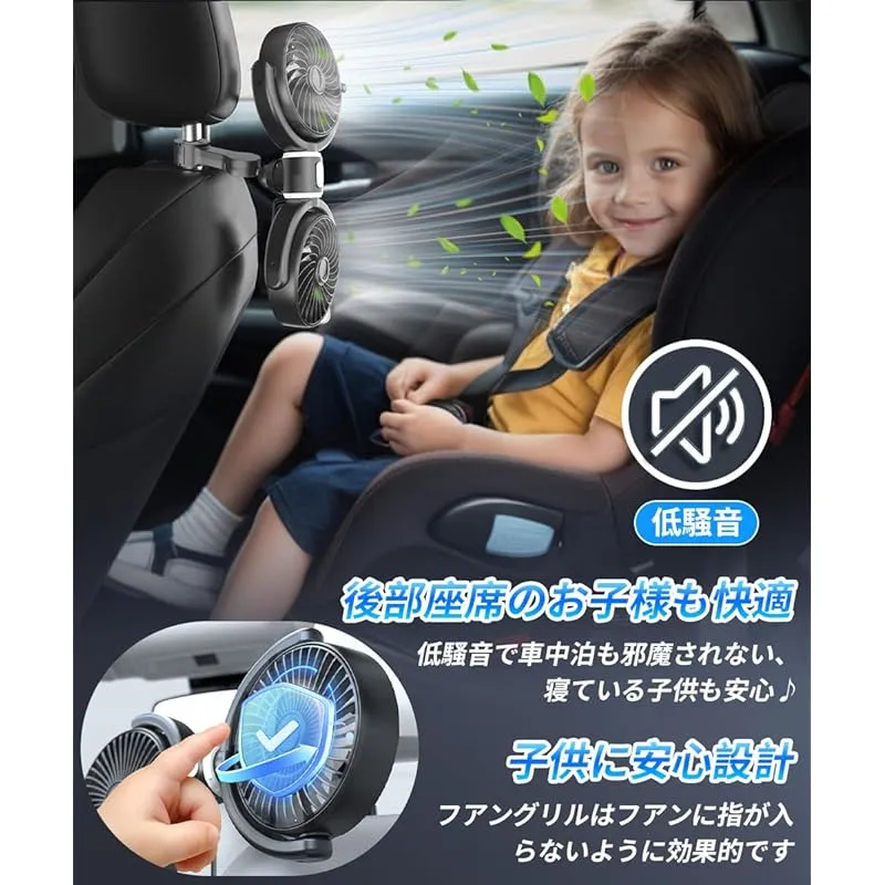【低騒音運転・子供ための安全設計】高品質モーターなので、強風モードで稼働しても騒音が低くし、お子様が寝ているでも全然邪魔しないような静音性を保つ車用扇風機です。また、お子供の安全を考量しており、細かな保護グリッド設計で、お子様の手が入らないように守ります。シンプルなスイッチで、誰でも直感的に操作可能になります。夏のドライブを楽々にしましょう~