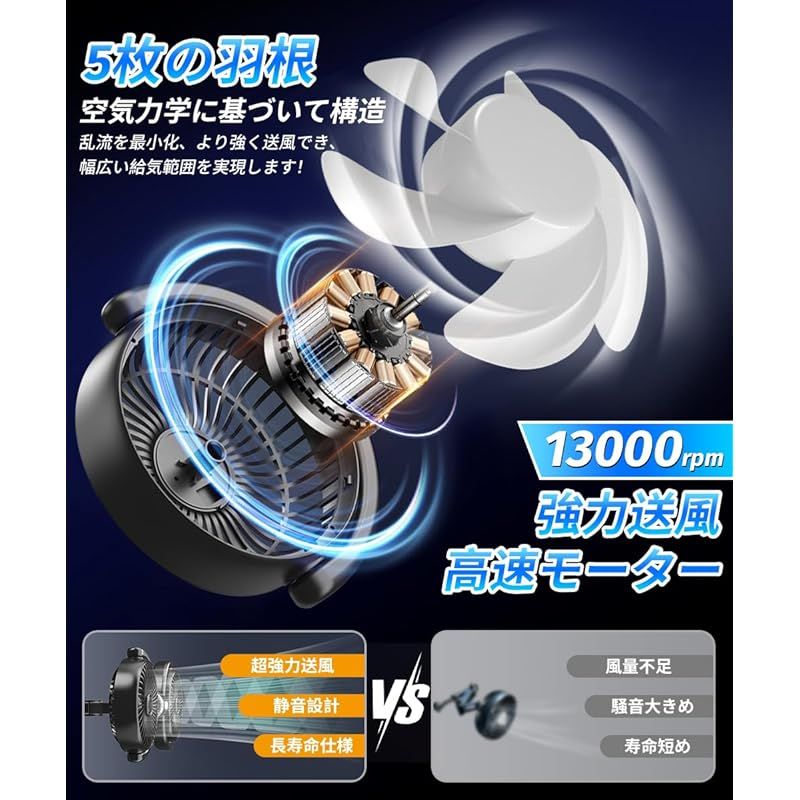 【高性能モーター・強力送風】USB車載ファンに高性能のブラシレスモーターを採用しており、長寿命を保ちながら、工ネルギ一効率を從来の機双頭車載ファンより約15%大幅改善されます。また、5枚流線型のタービン羽根、空気力学に基づいて構造は乱流を最小化し、風量を最大化に送風し、幅広い給気範囲を実現します!夏の蒸し暑さを一掃し、いつでも快適な車内空間を実現♪