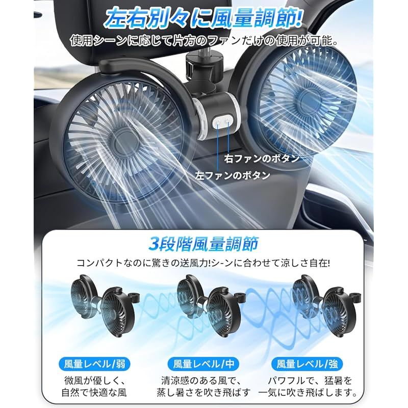 【猛暑対策・車内空気を効率に循環】車用扇風機は暑い夏に車内エアコンの冷房効果を大幅アツプ!2つのファンとエアコンを併用することで、車内の空気を素早く循環することができます。さらに、360°立体調整構造、回転ベースを自由に調節可能で、死角なし全車に送風します。冷房が効きにい後部座席にも爽やかな涼しい空気を届け、お子様も快適なドライブ空間楽しめます♪