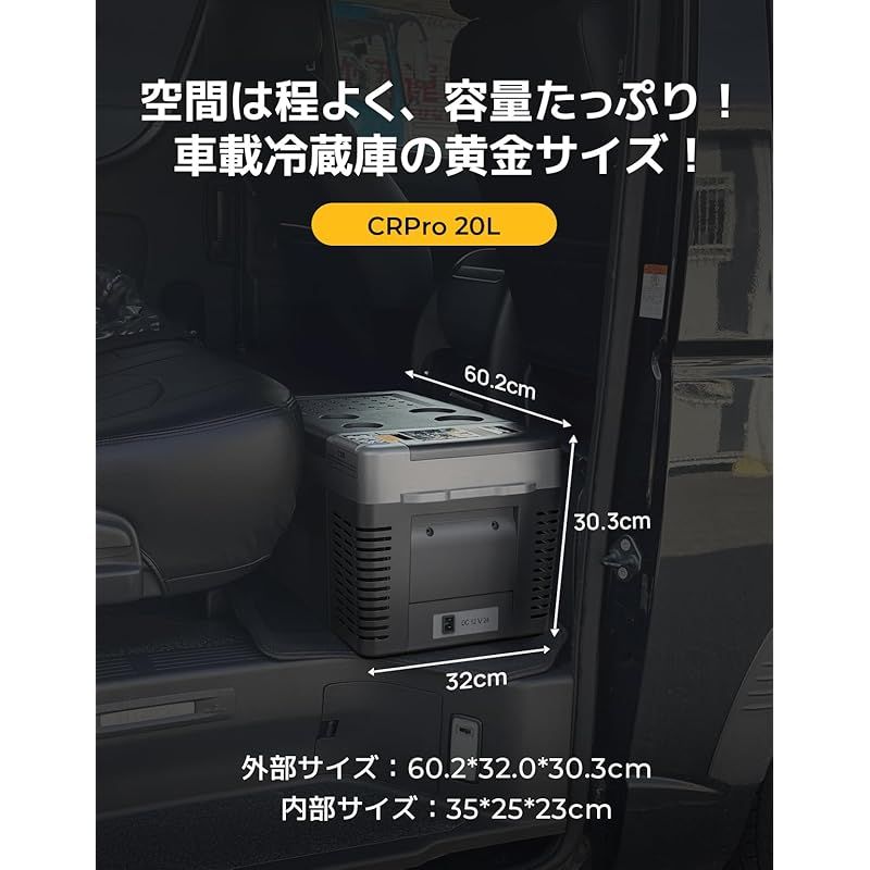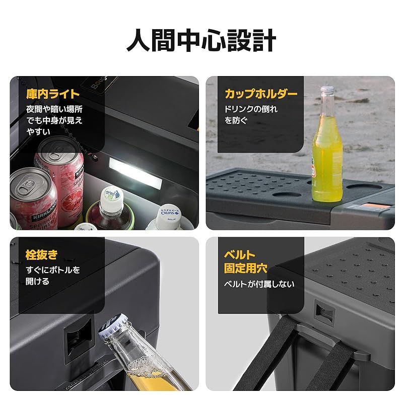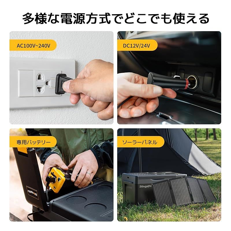 BougeRV 20L車載冷蔵庫には220Whバッテリー専用収納ケースがついており、別売りの専用バッテリーを内蔵することができ、同梱されているDCコードとACアダプターもすっきりと収納可能です。バッテリーを装着すれば、エンジンを止めた状態でも冷蔵庫を正常に稼働させることができ、利便性が高いです。車中泊、キャンプ、BBQ、釣り、買い物といったアウトドア活動に重宝します。こちらのポータブル冷蔵庫はコンパクトながらも20Lという大容量を実現し、350mlの缶ビールなら22本、500mlのペットボトルなら15本、2Lのペットボトルなら4本を入れられます。 内部のサイズは幅35cm×奥行25cm×高さ23cmで、外形寸法は幅56.5cm×奥行31.5cm×高さ31.5cmとなっており、小型車やコンパクトカーでも簡単に取り付けられます。こちらのコンプレッサー式ポータブル冷蔵庫は、温度を-22℃から+10℃まで設定できます(使用環境により、実際の温度と設定温度に±3℃の誤差が生じるのは正常です)。2つのモードから選択可能で、MAXモードでは急速に冷凍し、たった15分で0℃に、40分で-22℃まで下げることができます。また、省エネルギーのECOモードを利用すれば、消費電力を節約することが可能です。ACとDCの両方の電源に対応しており、室内でも車内でも多用途にご利用頂けます。DC入力(12V/24V)により、軽自動車から普通車、さらに大型トラックにも対応します。また、車で使用しないときに、AC電源(100V-240V)で家庭用のコンパクト冷蔵庫としても十分に機能します。45dBの静音設計で、寝室に置いても邪魔をかけません。
