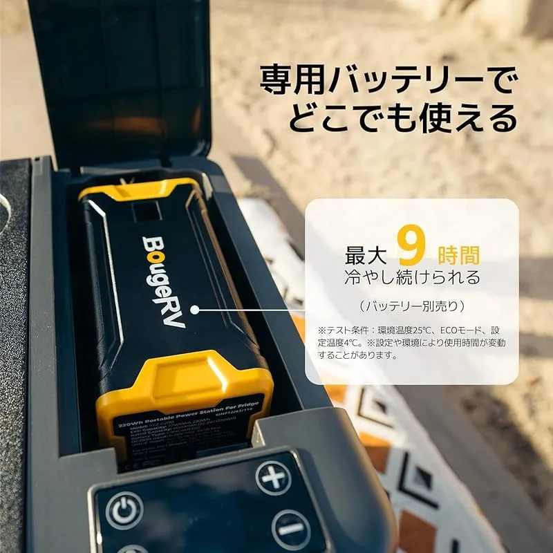 【バッテリー駆動でどこでも使える】BougeRV CR Pro 20L車載冷蔵庫は、別売りの277Wh専用バッテリーを内蔵することができます。このバッテリーにより、車のエンジンを停止した状態や電源がない場所でも冷蔵庫を最大14時間稼働させることができます。車中泊やキャンプ、BBQ、釣りなど、いろんなアウトドア活動にとても便利です。
