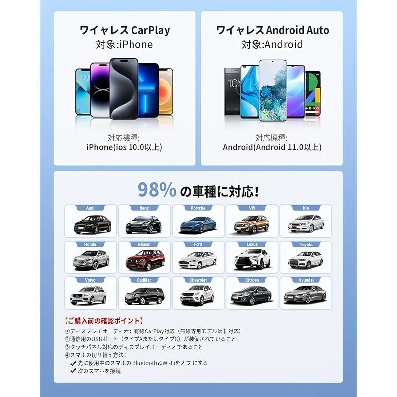 【ご購入前に必ずご確認ください】対応車両:2016年以降の純正有線CarPlay(iPhone:iOS10以上)または有線Android Auto(Androidスマホ:Android11以上)搭載車両。注意事項:本製品ではYouTubeやNetflixなどの動画視聴はできません。Wi-FiとBluetoothは同時にオンにし、他のデバイスと接続していない状態でご使用ください。無線Android Auto接続時には、Bluetooth接続画面は表示されません。本製品は初期ペアリング時にBluetoothで接続し、その後のデータ通信はWi-Fiを使用します。そのため本製品使用中は、スマホのWi-Fiを車載Wi-Fiに同時接続することはできません。電源供給が不足する場合は、バイパス電源ケーブルをご利用ください。詳細はカスタマーサポートへお問い合わせください。CarPlay対応車両ではiPhoneのみ無線化可能です。Android Auto対応車両ではAndroidスマホのみ無線化可能です。