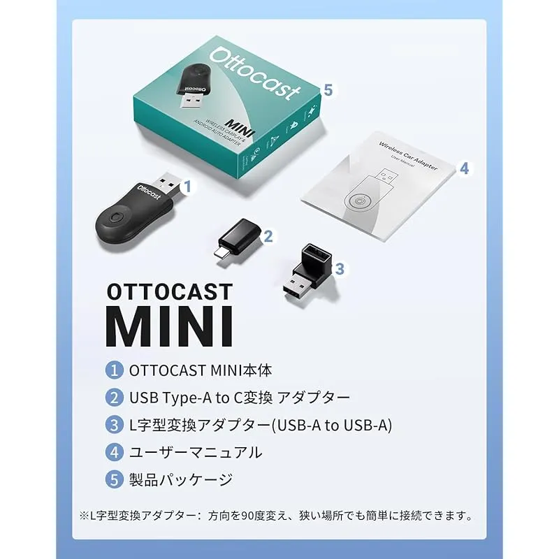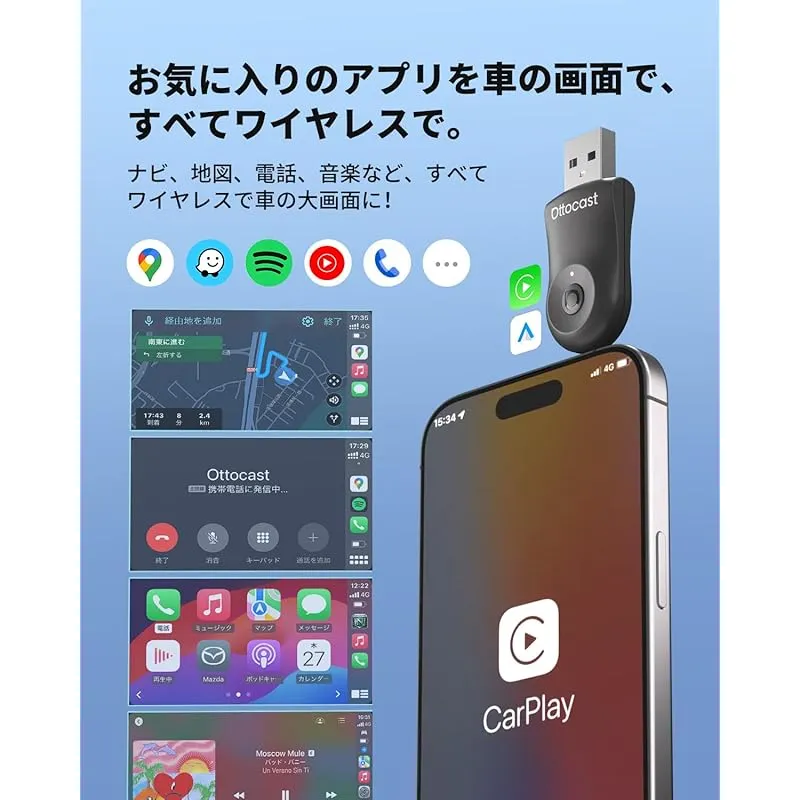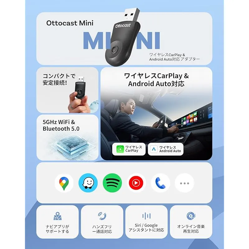 【公式】OTTOCAST オットキャスト Mini 2025最新 ワイヤレスCarPlay/Android Autoアダプター ミニ 純正有線CarPlay/Android Auto対応車専用 Bluetooth音楽/通話対応 プラグ&プレイ 自動接続 技適認