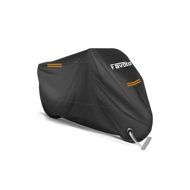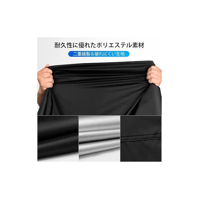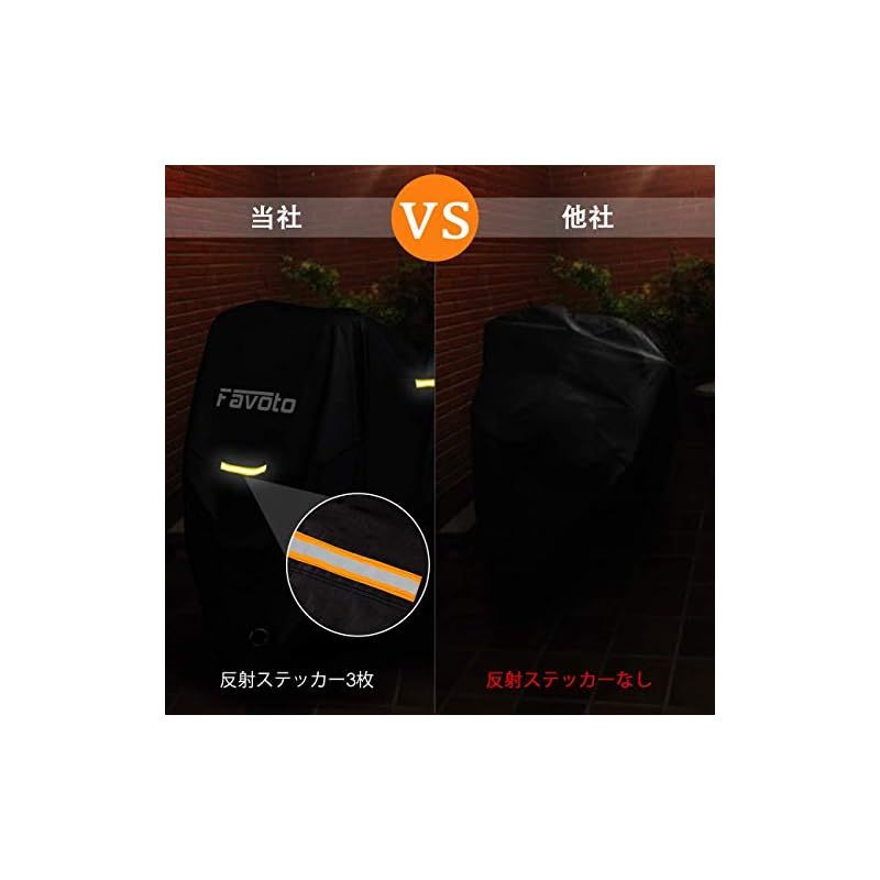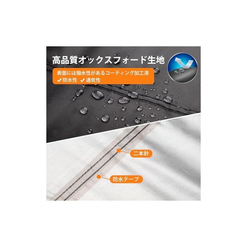 【防水加工】Favoto バイクカバーの表面層には防水加工を施し、雨水の浸入を防ぐとともに、風や雨や雪などの悪天候によるダメージから愛車を完全に保護します。バイクカバー本体を二本針ミシンによる縫製しています。 二本針ミシンは一本針ミシンより強度があり、破れにくくなっています。 また、内側にある上部の縫い目には防水テープが貼られており、縫い目から雨水が侵入する防止。