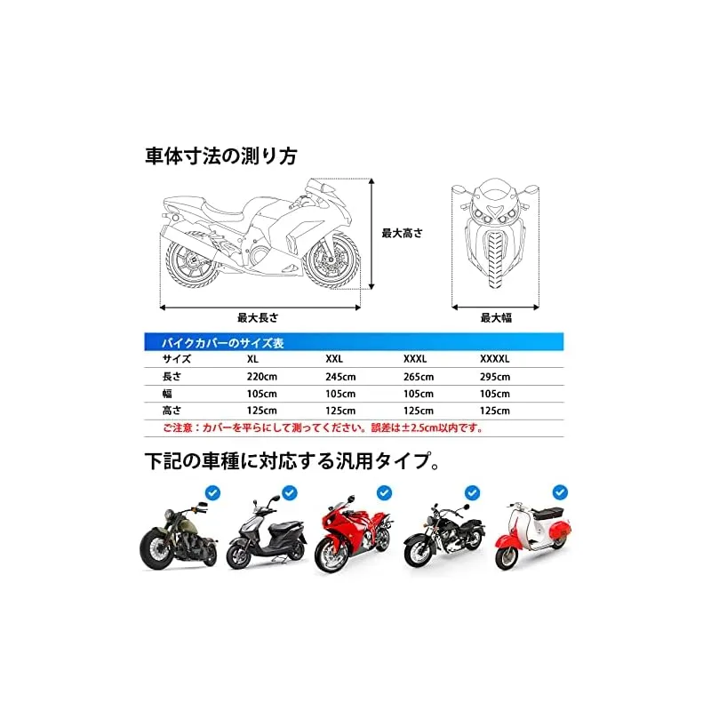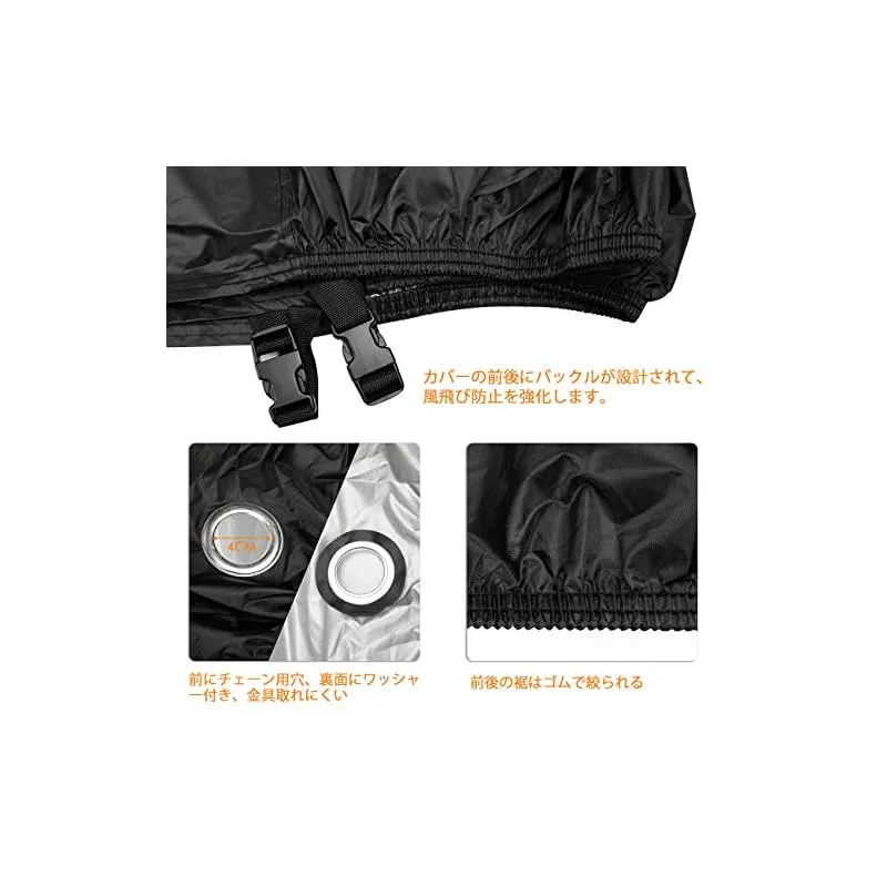 【2.5m締めるベルト】900円相当の防風ベルトが付属しています。 全長は2.5mで、ベルトの長さもご愛車によって調整できます。強風時には、車体中央からベルトで縛ることで、強風によるバイクカバーの飛び出しを防ぐことができます。ご注意:仕様アップデートのため、防風ベルトは2種類のいずれかをランダムでお送りします。予めご了承ください。