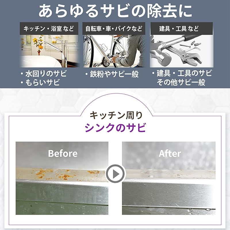使用箇所】 車 バイク ガソリン タンク 鉄粉除去 錆取り 燃料 タンク 錆取り アルミホイール 自転車 チェーン キッチン サッシ シンク 排水口 蛇口 包丁 工具 鉄 メッキ もらいサビ ゴルフクラブ 釣り道具 ルアー アクセサリー 金属 鉄 車の鉄粉などの錆取り
