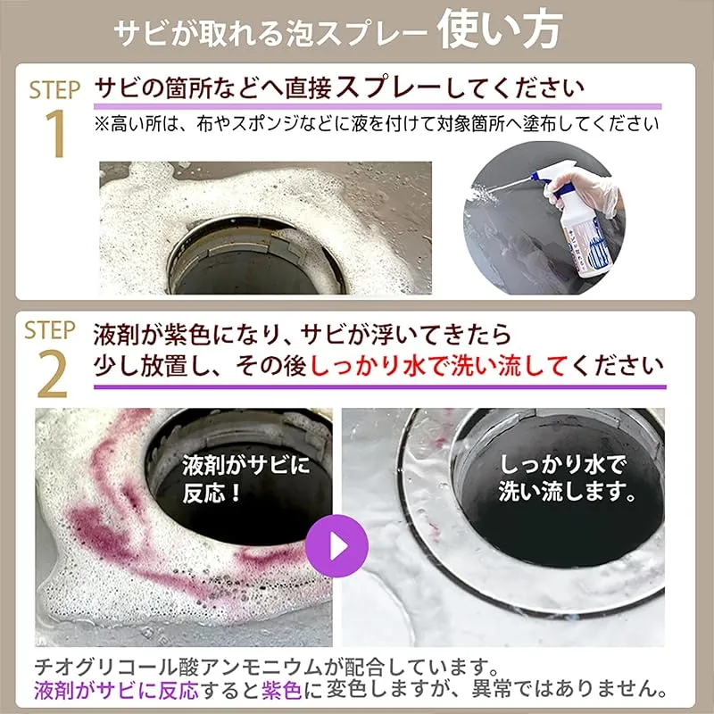 チオグリコール酸アンモニウム配合のため、泡液剤がサビに反応すると紫色に変色しますが異常ではありません。