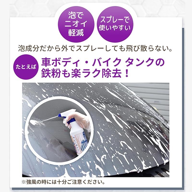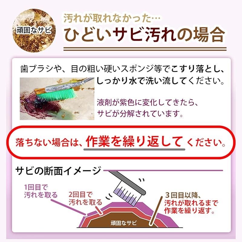 中性だから素材を痛めず、チオグリコール酸アンモニウムをたっぷりと配合した泡成分で分解が早い。 チオグリコール酸アンモニウム配合のため、液剤がサビに反応すると紫色に変色しますが異常ではありません。