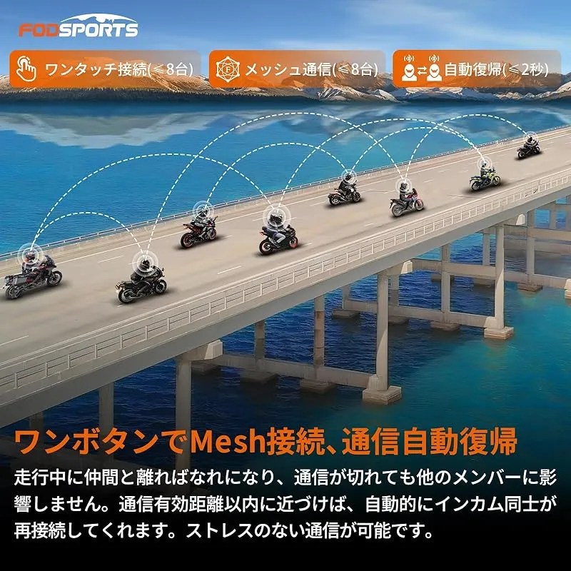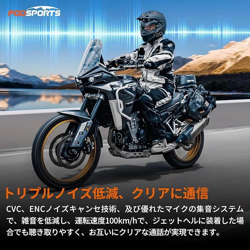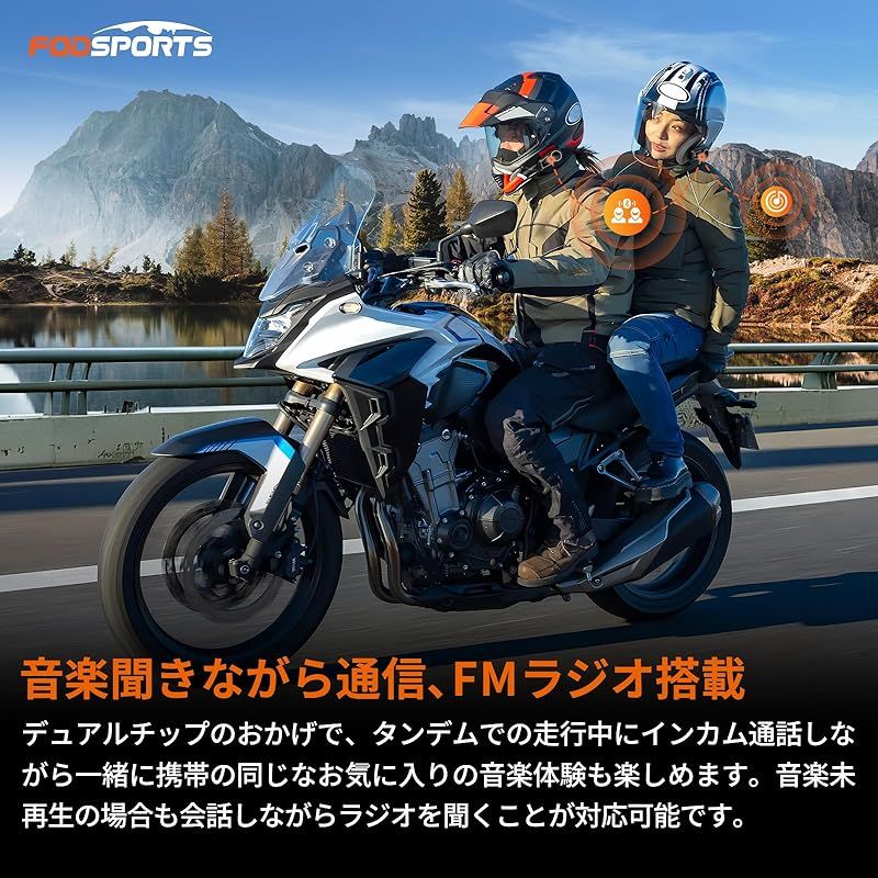 商品名:FODSPORTS バイク インカム FX7 メッシュ通信 インカム デュアルチップ 音楽聴きながら通話 8人同時通話 HIFI音質 ワンタッチ全部接続 通信自動復帰 音楽共有 FMラジオ IP67防水 CVC&ENCノイズキャンセリング 異なるデバイスと接続