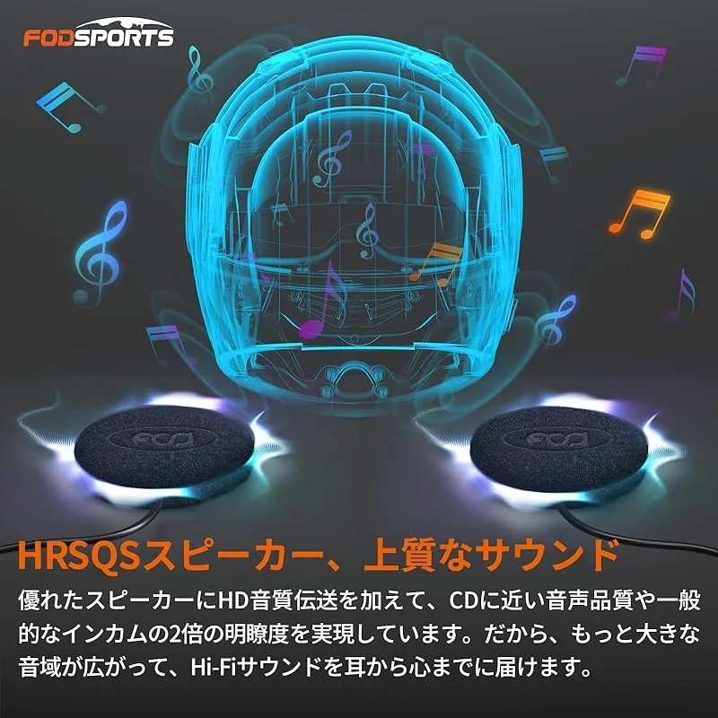 【Qualcomm Bluetooth v5.4チップ・原音再現&Hi-Fiサウンドに包まれる空間】FX7 バイク インカムは世界有名メーカーQualcommの先端Bluetoothチップ2枚を配備し、強化されたアンテナを搭載して、データ伝送速度がより高速化、高音質化、低遅延化、接続安定性、消費電力低減などを実現しました(※周囲の障害物や外部電波環境により、異なることもある)。同梱HRSQSスピーカー(直径:40mm厚さ:10mm)には、シルクダイヤフラム材質、優れた生物振動板及びドライバーユニットを採用し、音の音色や解像度が標準スピーカーより2倍増になりました。本インカムは良い再生システムでリスニングルームのようなリアルな臨場感を作り出すことで、CDレベルのステレオ効果で、音楽鑑賞を提供します。大音量にしても、低域から高域までクリアな音質を保ち続けられました。