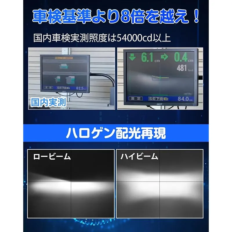 【HI/LO切替可&車検対応】SUPAREE社のh4 led ヘッドライトはハロゲンとほぼ同じ配光を実現して、シェードを正確に配置することにより、カットラインもしっかりでてるので、新車検基準を満たしています。グレア光を純正ランプと同等レベルに抑えて、対向車等周りにも迷惑な眩しさが無く、夜間の走行が非常に楽になり、安全に運転しています!日本で車検も試しました、装着した時のcd(カンデラ)では、平均54,000cdをマークします!ハロゲンバルブの10倍以上の明るさになります、またハイビームでは、ほとんどの車両で驚きの65,000カンデラ以上となります、その数値はハロゲンより10倍以上の明るさ、元の車検基準の8倍でした。※ご注意:車検に関しては、地域により検査員の基準が異なる場合がございます。