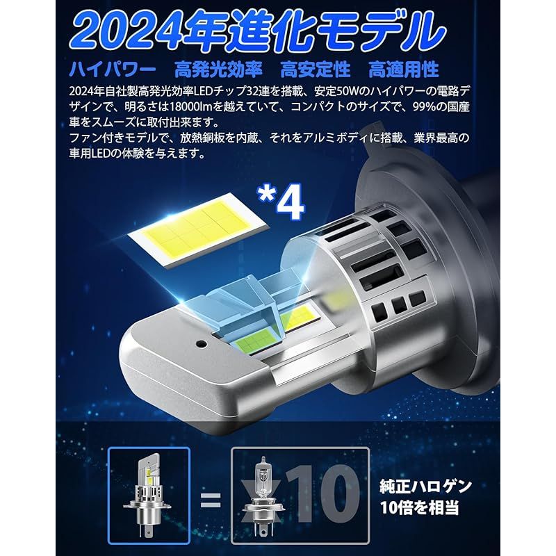 商品名:SUPAREE h4 led ヘッドライト hi/lo 爆光 車検対応 6500K 18000m 車用 32連高光効LEDチップ 9-16V 四重放熱 ハイパワー50W 静音ファン ハロゲンサイズ 長寿命 ノイズ・EMC抵抗 2個セット