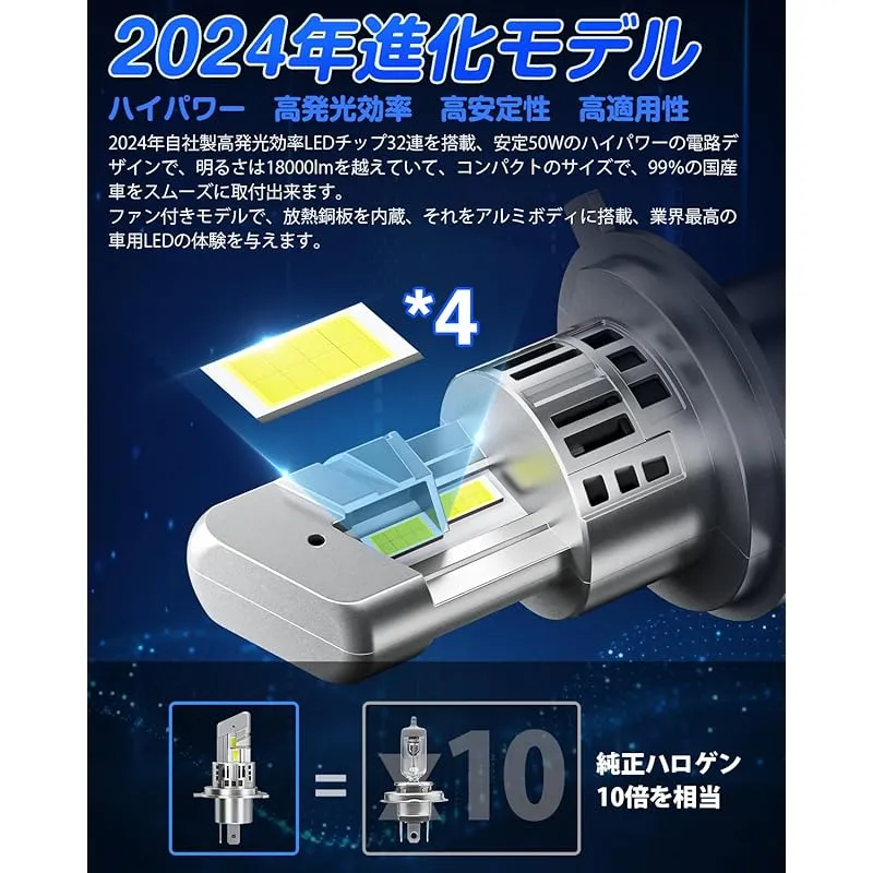 【新規最強輝度】一体型の明るさは暗くて、ハロゲンでも足らない?ヘッドライトのサイズは大きくて、取付は専門業者に頼まなくちゃ?取付後、ラジオは雑音ばかり、車コンピューターもエラー出ている?。SUPAREE最新のh4 led ヘッドライト製品は以上の問題全て解きました。正真正銘のハロゲンサイズ、コンパクトの上で、本社伝統的な爆光を引き続けました、25W*2のハイパワーで、32連高光効のLEDチップを搭載したのため、18000lmの明るさに出来ます、車検基準より8倍を越えて、10倍のハロゲン明るさを相当!