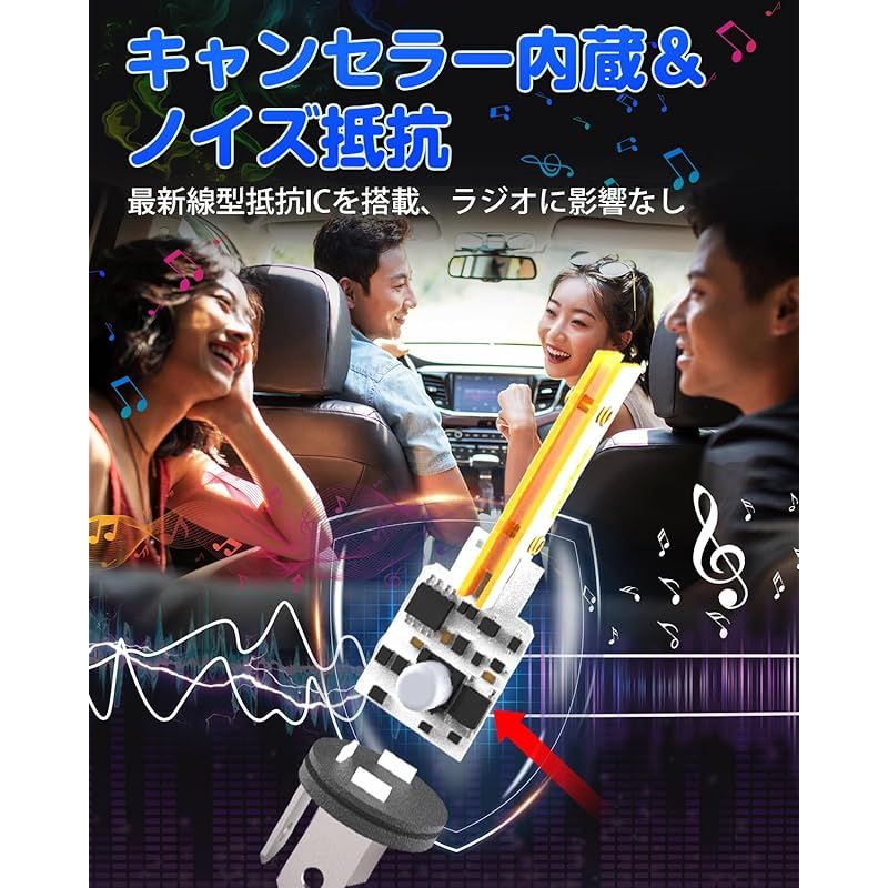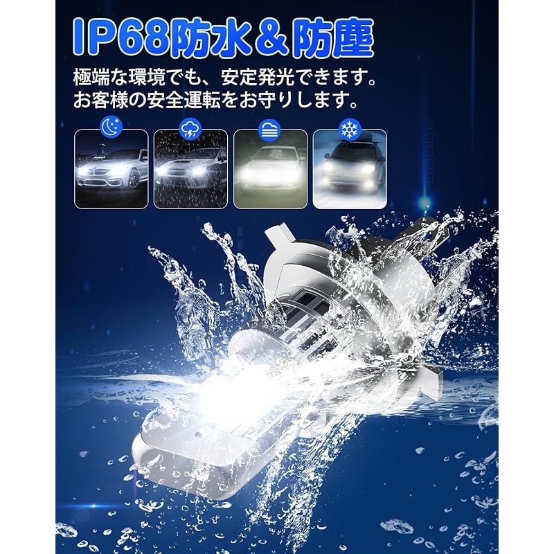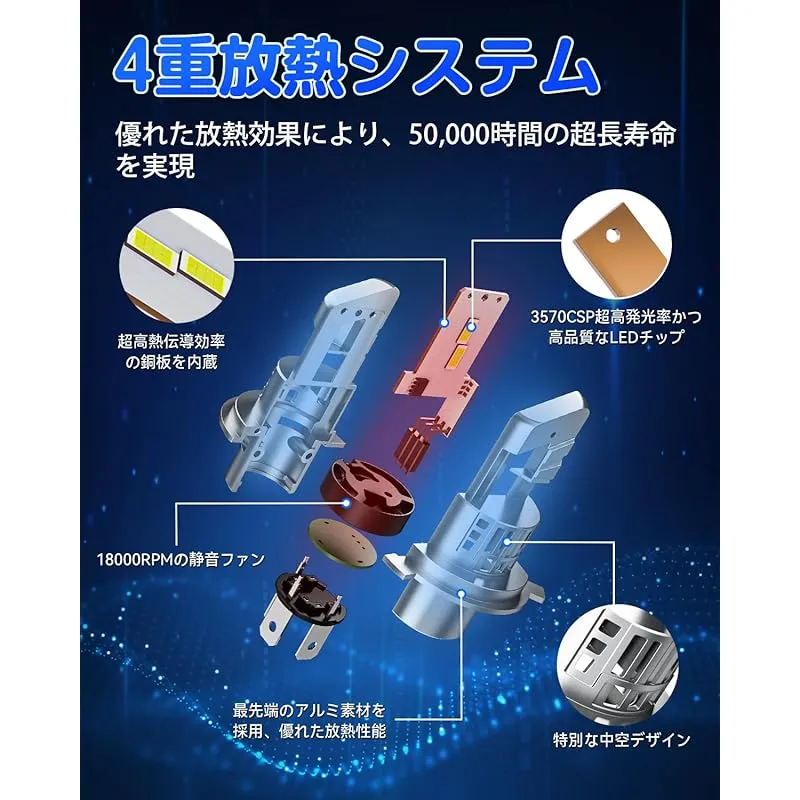 【3重放熱&IP68防水】ほかのh4 led ヘッドライトを取付ばっかりで、不点灯になりました、その現象はファンが不良の問題でLEDチップが高温を耐えません、ランプが不点灯になりました。本製品は高速冷却ファン付きで、LED基板の下が最高熱伝導効率の銅板を内蔵されています、航空用アルミニウムボディーに熱を伝導して、空気への放熱効率は従来品よりもっと速くてしています。さらに、IP68の防水防塵レベルで、極端な環境でも、安定発光できます。お客様の安全運転をお守りします。また、日本車専用キャンセラーを搭載、コンパクトサイズで、複雑な配線なし、取付便利の上で、99%の車種対応できます。ご注意:日本車専用キャンセラー、外車にはいけません。業界最新の線型キャンセラーを搭載で、日本のFM周波数帯域に影響がありません、ラジオにノイズを入りません。まだ、車コンピューターの異常エラーも出ません。