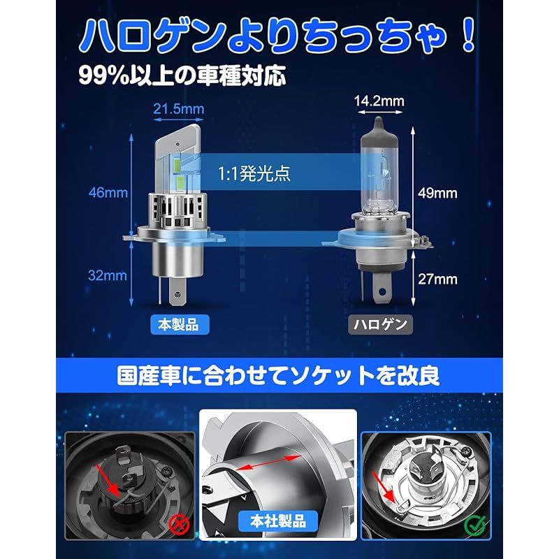 【ポン付け&取付簡単】ユニットとエンジンの間が狭くて、手を伸ばせない、取付は専門店の高料金をかからないといけません?本社のh4 led ヘッドライトは純正ハロゲンサイズにほぼ1:1なので、元はハロゲンバルブの車は女性でも簡単に取付できます。本社製品の後ろの部分では、ロックの穴が深くなって、従来品のロックできない現象より、取付はもっと簡単になりました。本社初代目一体型より、ジムニーなどの車種でもポン付けできました、99%の車種適用できます。ご注意:元のH4ヘッドライト型番である車のみ適合します。