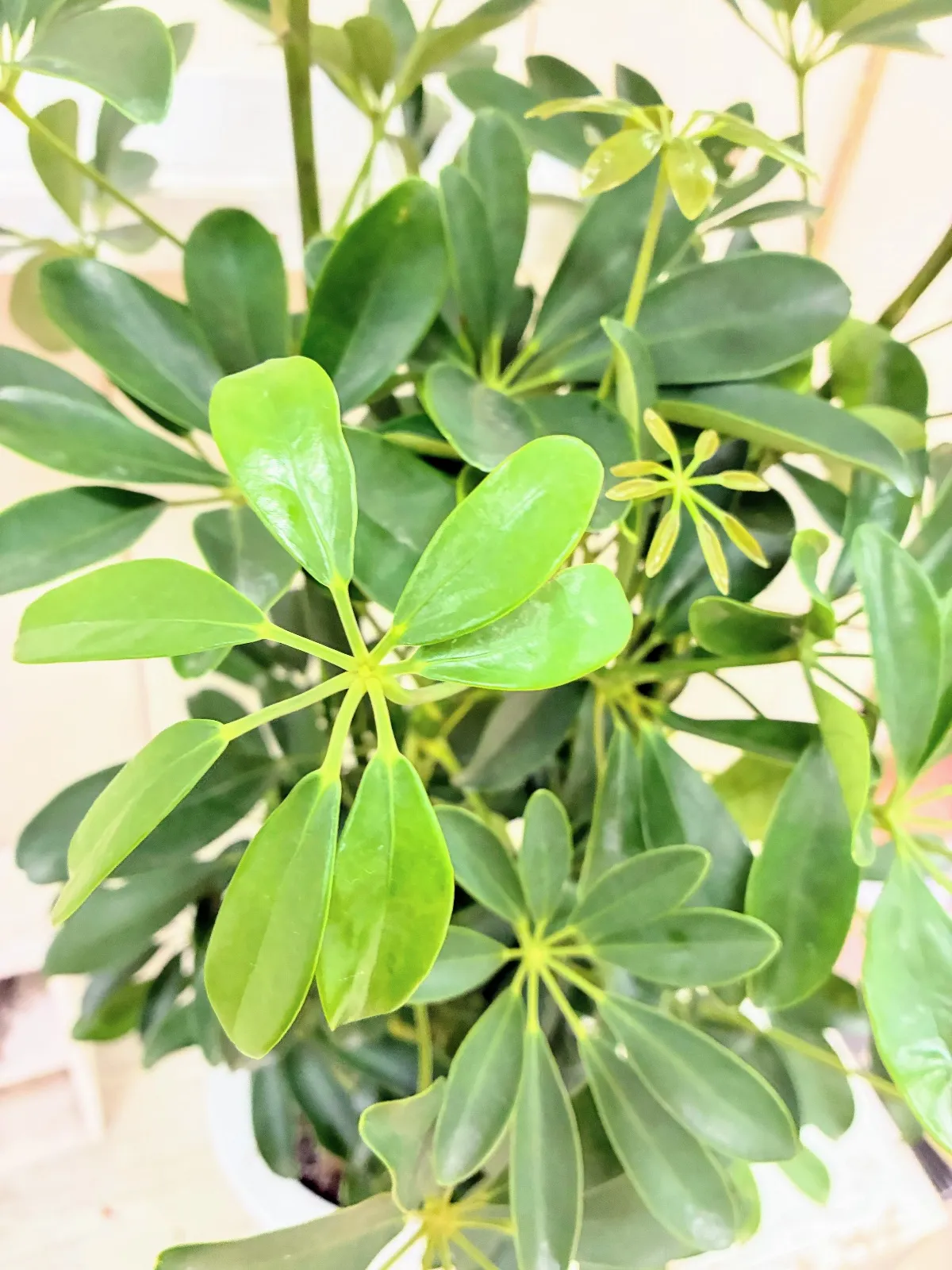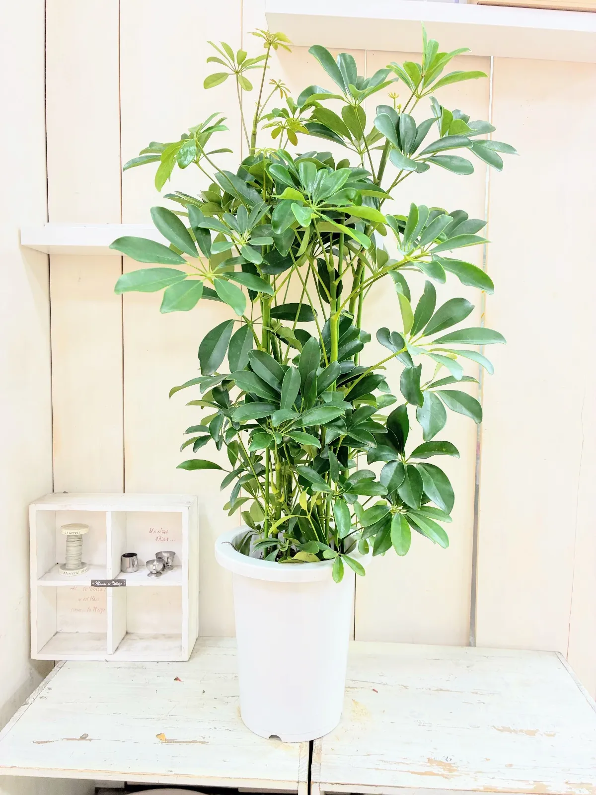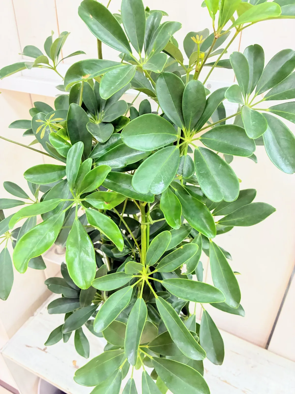 シェフレラ・ホンコンは、手のひらのような葉が特徴的な植物です。別名「ヤドリフカノキ」とも呼ばれています。 寒さに比較的強く耐陰性もあるので、初めて植物を迎える方にも育てやすいです。厚みのある葉はつやつやとしており、インテリアグリーンとしても人気があります。
