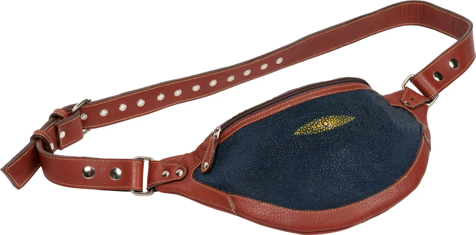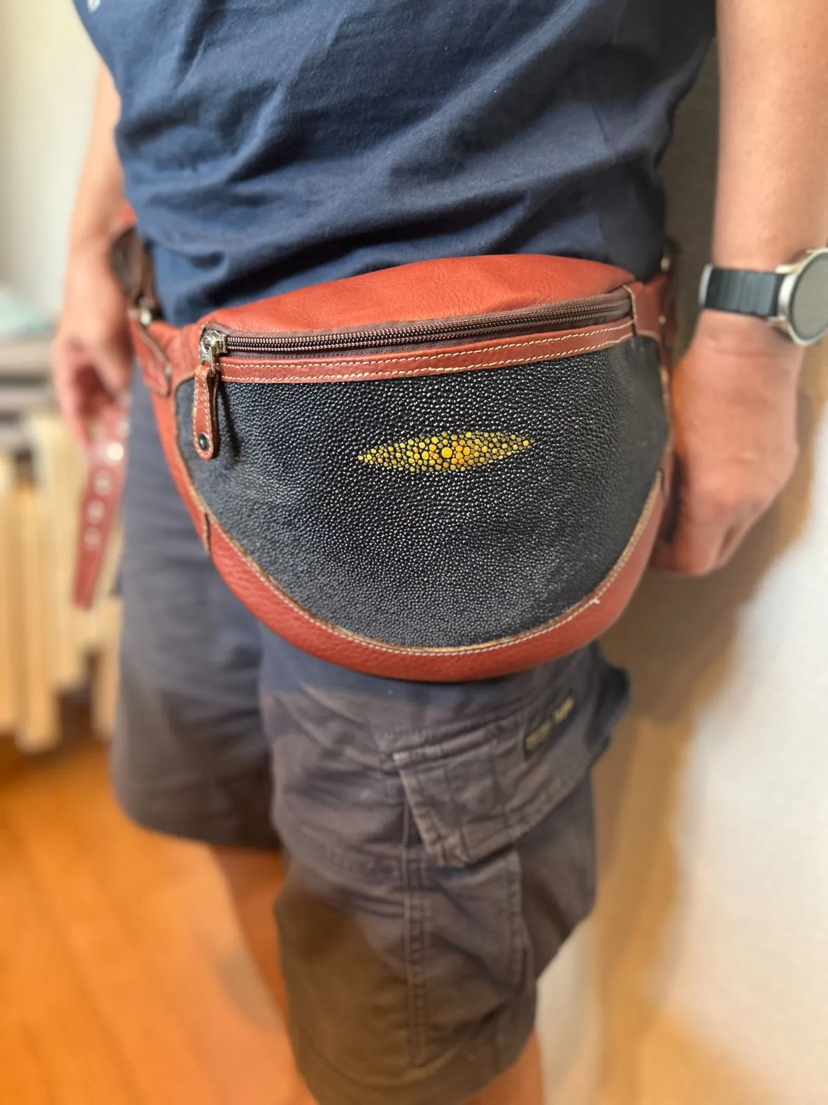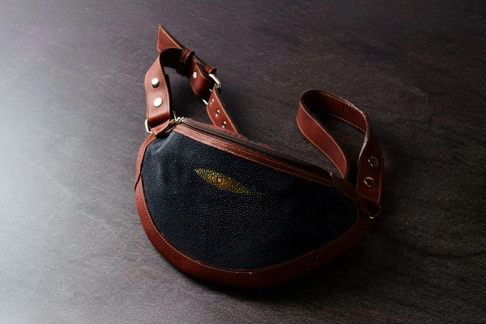 「革バッグスティングレーコンビ」は、希少性と耐久性を誇るエイ革(スティングレー)と、上質な牛革を組み合わせて仕立てた、存在感あるバイカーズパックです。ウエストバッグとしても、ボディバッグとしても使用できる設計で、走る時間にも、日常の移動にも寄り添います。