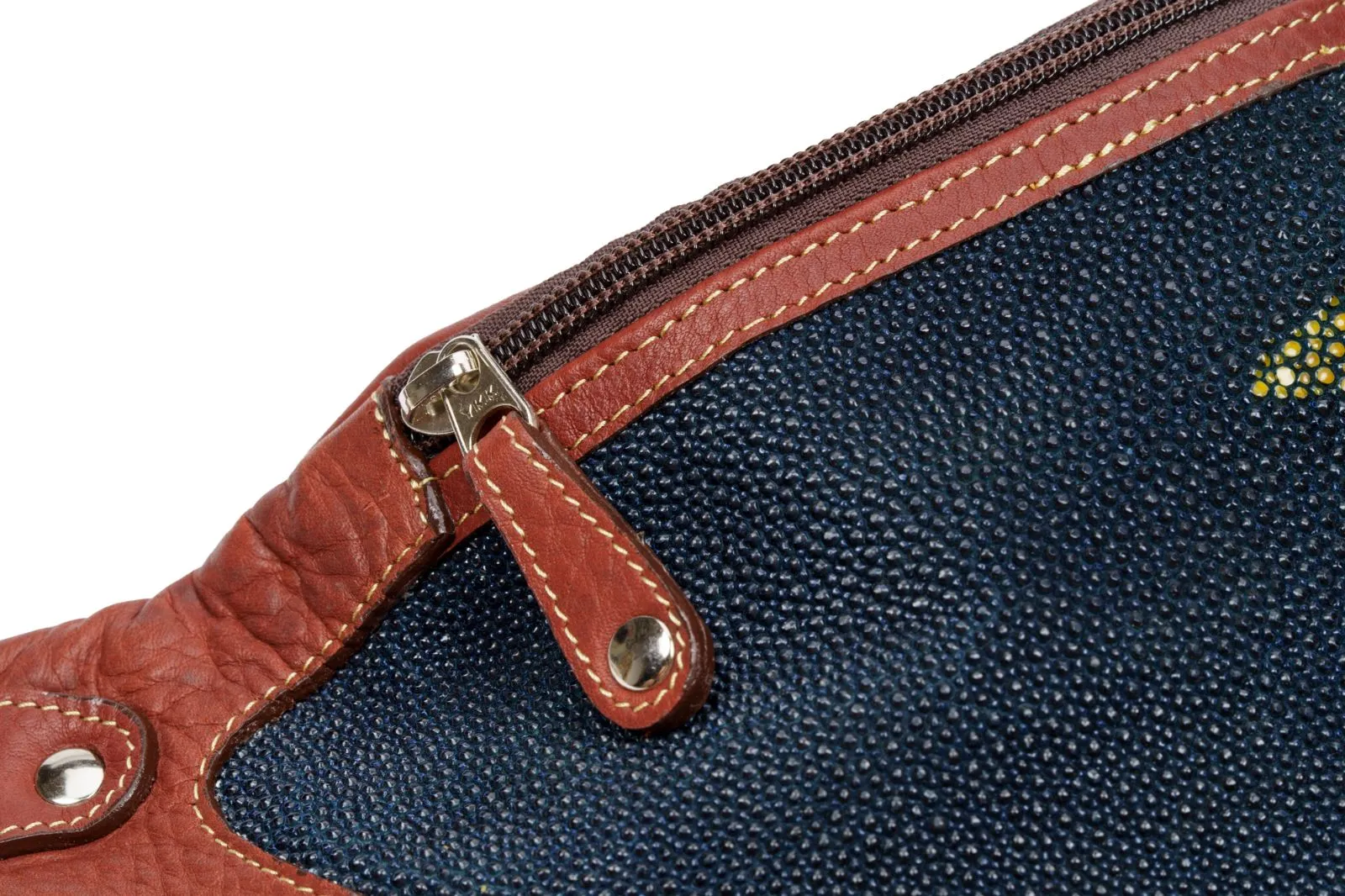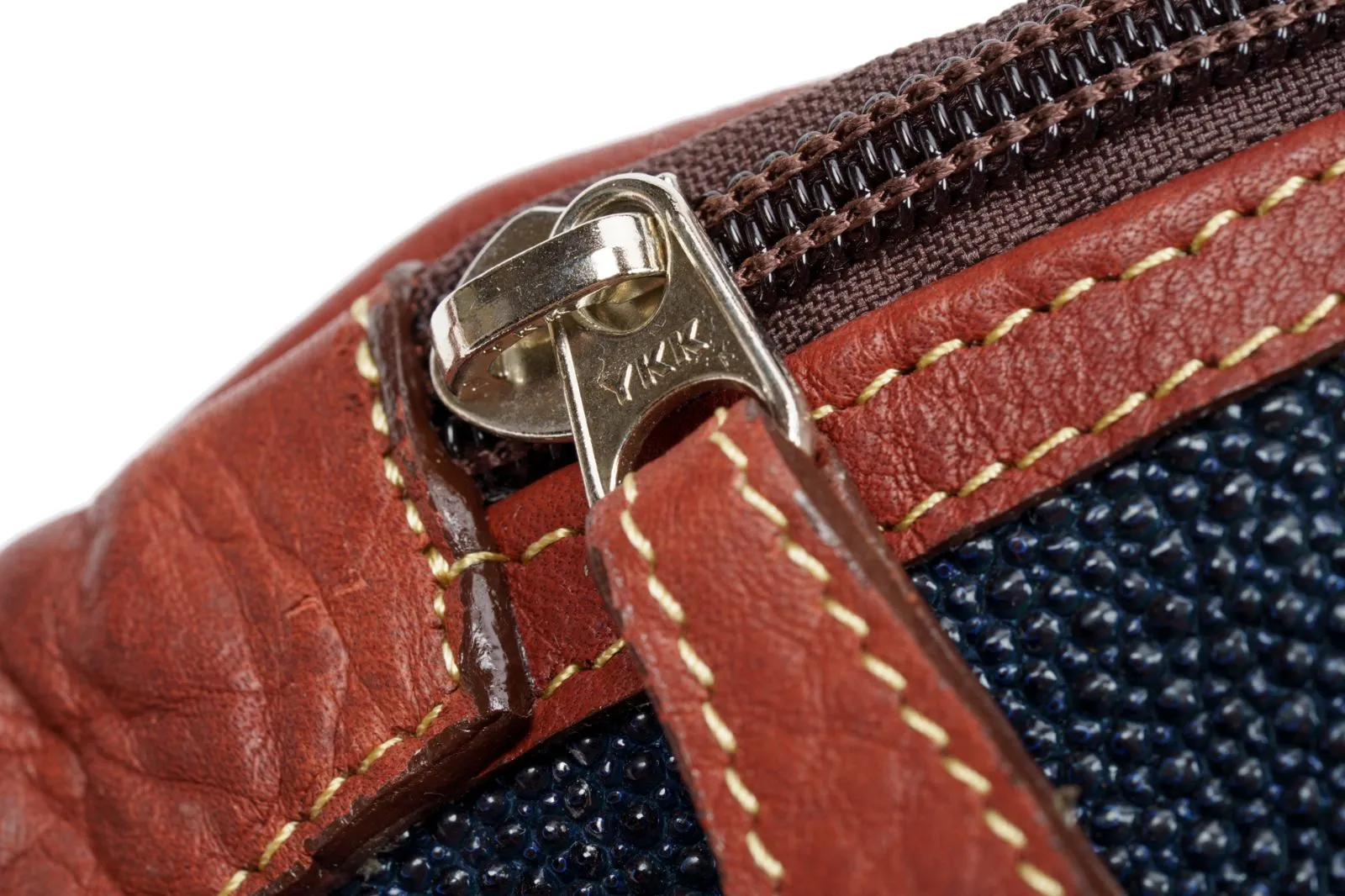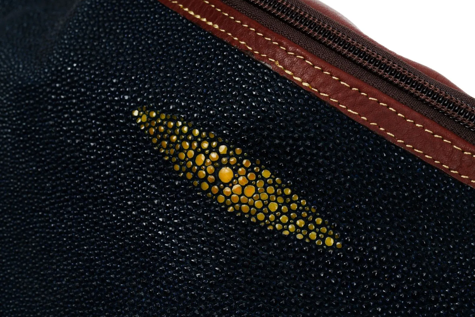 最大の特徴は、フロントに配されたスティングレーの独特な輝き。ビーズを敷き詰めたような表情と、角度によって静かに反射する光沢は、「海の宝石」と称される所以です。スティングレーは非常に硬く、傷や水に強い素材として知られ、長年の使用にも耐える堅牢性を備えています。その周囲を包み込む牛革は、使い込むほどに柔らかさと深みを増し、持ち主の時間を映すようにエイジングしていきます。