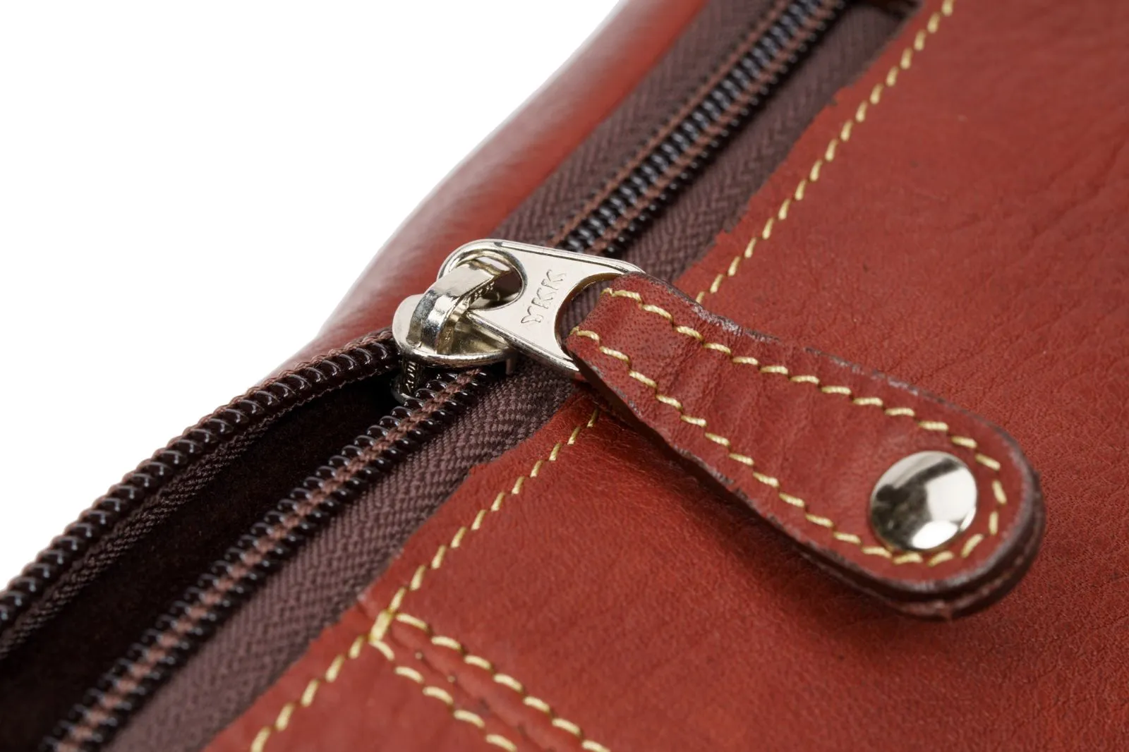 サイズは大きめで容量も十分。高さ約19cmの設計により、財布やスマートフォン、キーケース、サングラスなどを無理なく収納可能です。外側にはファスナー式ポケットを備え、使用頻度の高い小物の出し入れもスムーズ。内部はシンプルな構造とすることで、無駄を削ぎ落とした使いやすさを実現しています。開閉は安心感のあるファスナー式。約560gの適度な重量は、安定感と品質の証です。