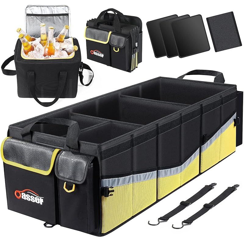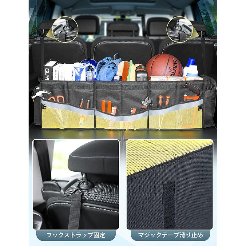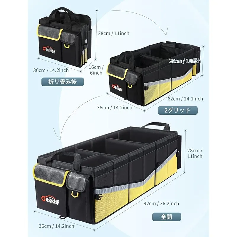 Oasser トランクボックス 車 収納ボックス トランク ラゲッジルーム 収納95L大容量 保冷保温 折り畳み式 仕切り付き 取っ手 反射シール マジックテープ滑り止め カーバー製品紹介取り外し可能な漏れ防止保冷バッグ付き、保冷保温、ピクニック、キャンプ、アウトドア旅行などに最適オックスフォード防水生地使用、丈夫で崩れにくい、傷つきにくい、洗浄しやすい仕切り付き、需要に応じ空間カスタマイズできる、使わない時は畳むことでスペースを節約できる底部にマジックテープ式滑り止めがあり、走行中勝手な移動を防ぐ多数のサイドポケットとメッシュポケットがあり、小物などを入れられる、トランクをスッキリにするカーバーが付属され、防塵な上にプライバシーも守れる