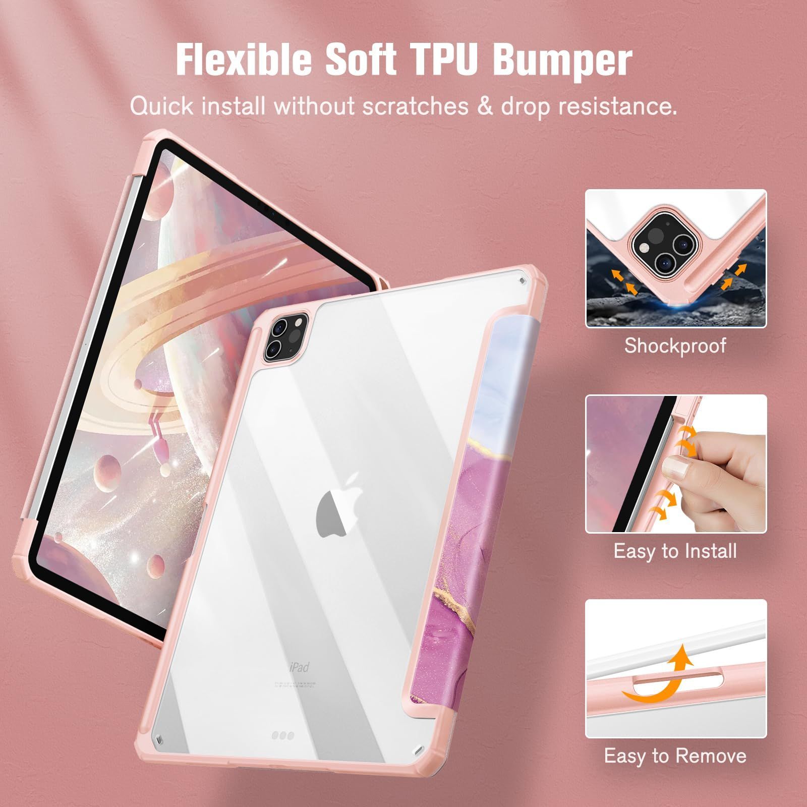 Fintie iPad Pro 11 ケース 2022/ 2021/ 2020/2018 11インチ 透明バックカバー Apple Pencil 収納可能 Apple Pencil 2 ワイヤレス充電対応 三つ折スタンド スリープ機能 軽量 薄型 傷つけ防止 PU合成レザー TPU (モデル番号A2435、A2759、A2761、A2762)(柄 X マーブルピンクA)