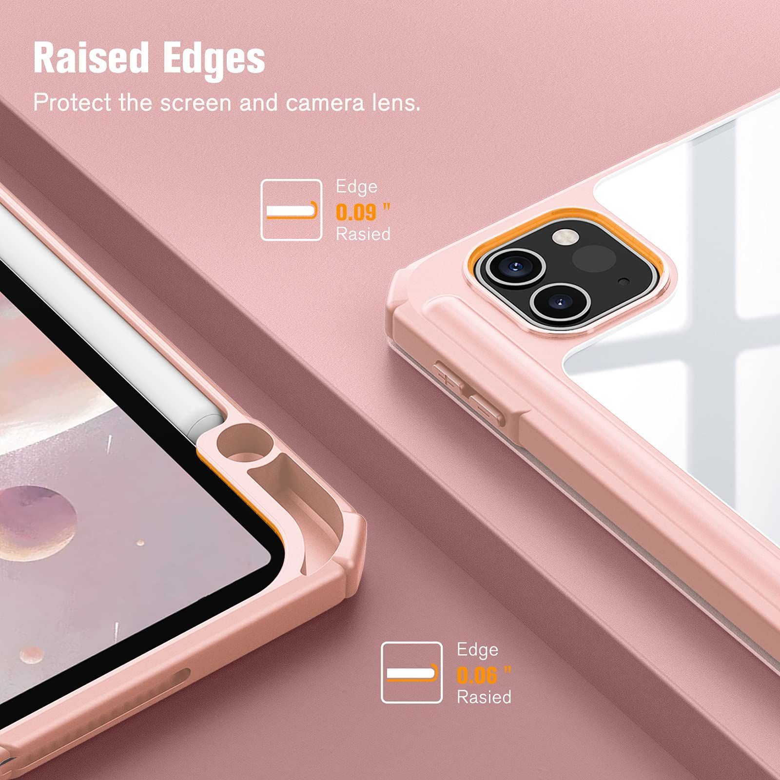 【材料・透明バックカバー】 ケースの表面はPUレザー素材を利用して、軽量、超薄を備えます。ポリカーボネート素材を採用している透明バックカバーは汚れや傷つけなどを防止するだけでなく、iPad本体の色と美しさも活かせます。透明バックカバーの枠は柔軟な TPUを採用して、取り付けも簡単にできます。フロントカバー内部材質はマイクロファイバーで、摩擦によって発生する傷を抑え、液晶画面を保護しきれいに保ちます。(ご注意:透明バックカバーには保護用のフィルムがついていますので、ご使用前に保護フィルムを剥がしてください。)