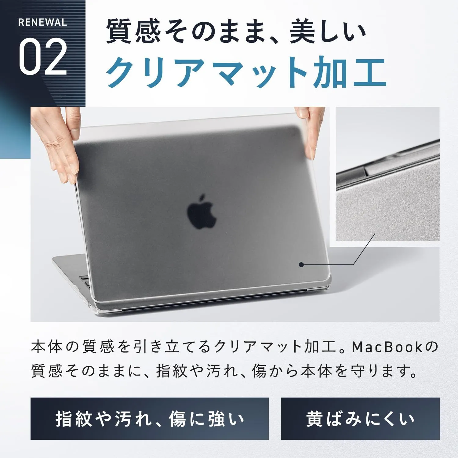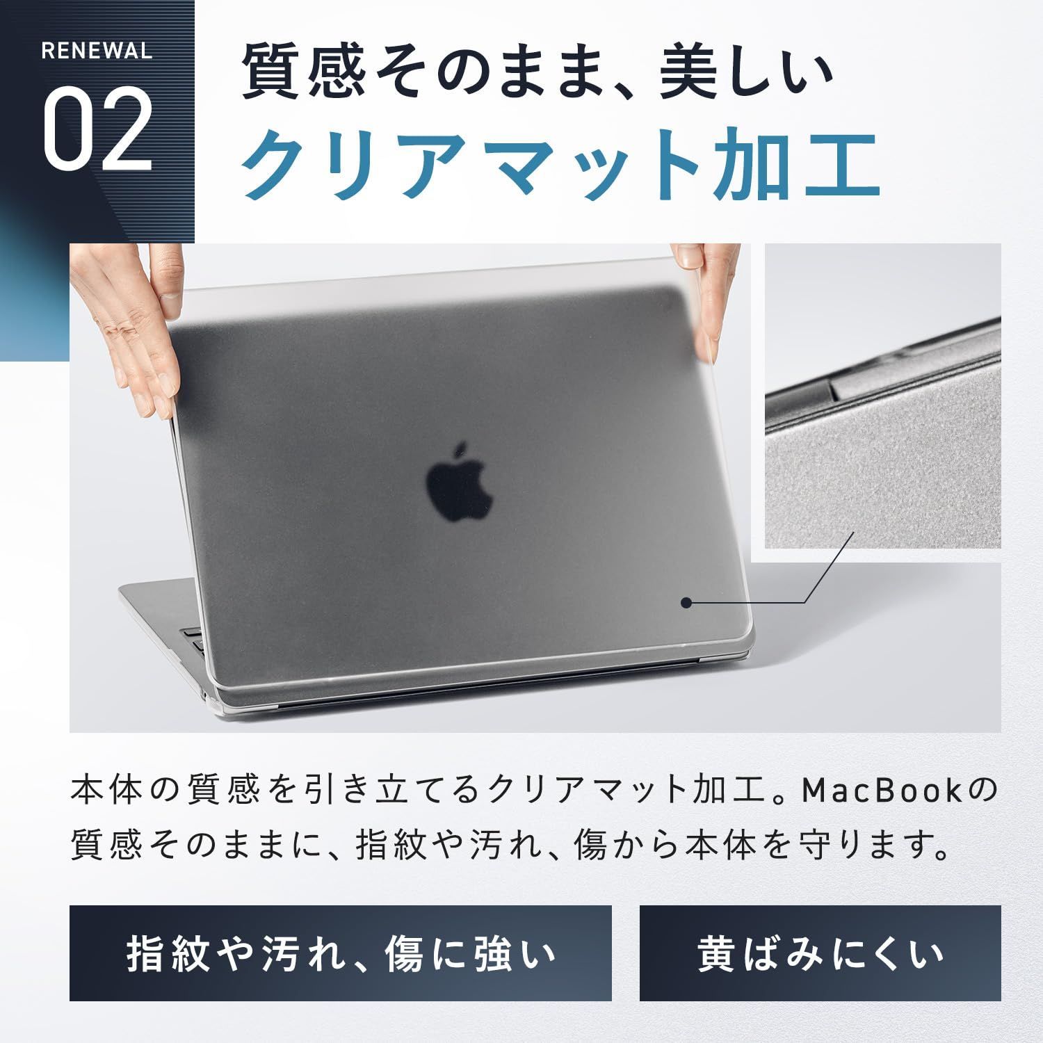 【MacBookの質感そのまま、美しいクリアマット加工タイプ】MacBook 13インチ 本体の質感を引き立てるクリアマット加工。MacBookの質感そのままに、指紋や汚れ、傷から本体を守ります。