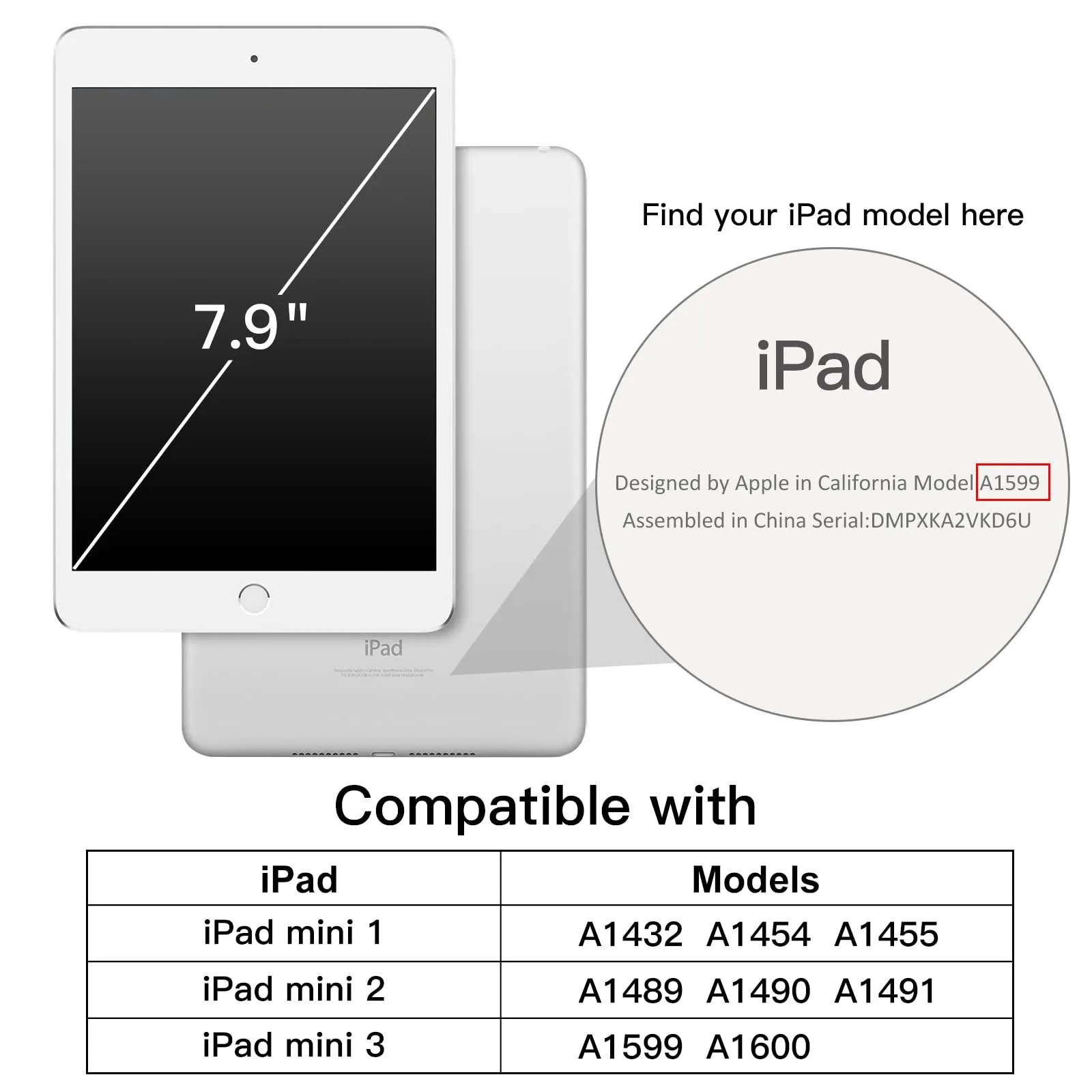 iPad mini 5 2019モデルに対応できない。iPad mini 1/2/3のために専門設計。ご購入の前、iPadの機種をご確認お願いいたします。デバイス裏面のモデルを確認ください。(対応モデル:A1599/A1600/A1489/A1490/A1491/A1432/A1454/A1455)