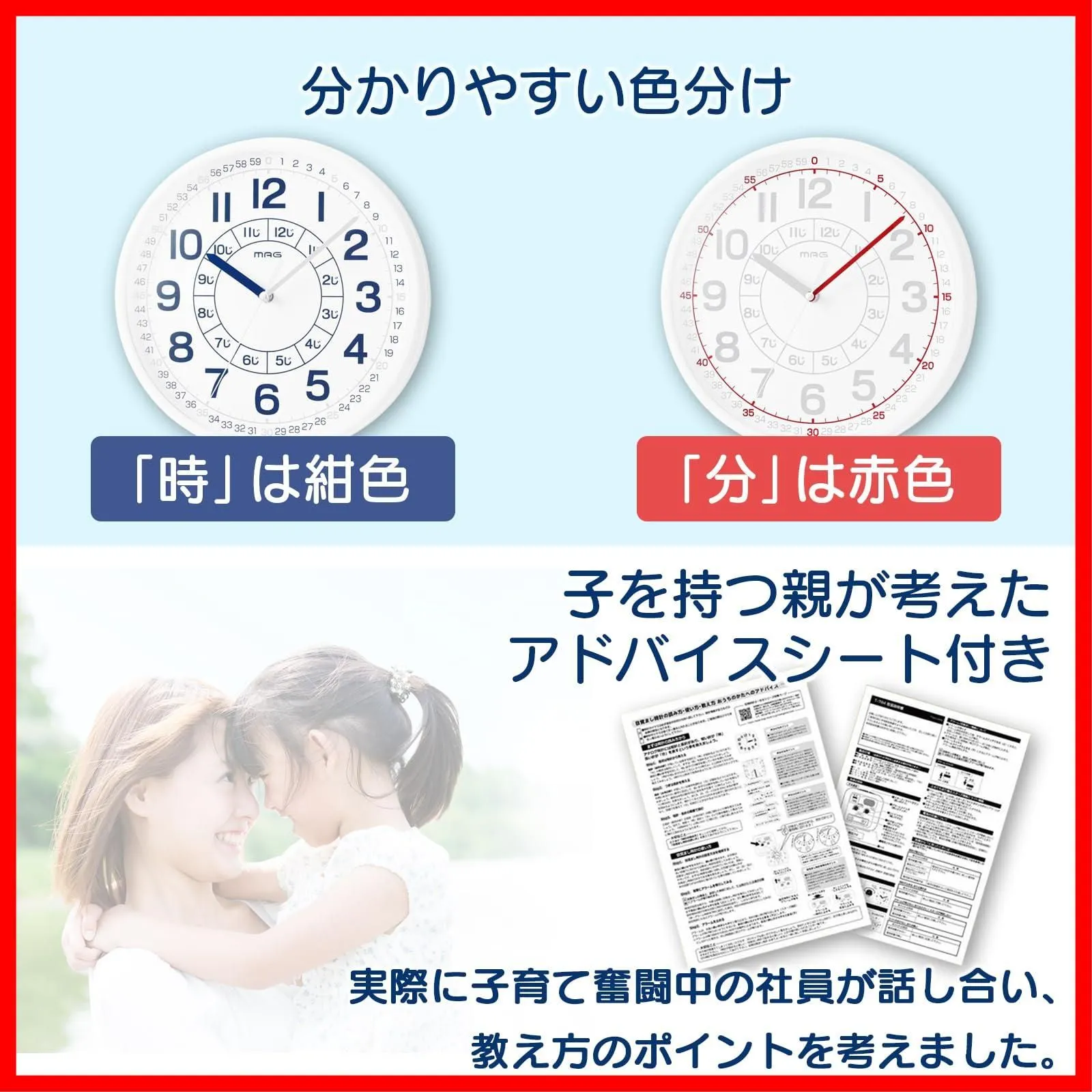 ●取り扱い説明書には、お子様への時計の読み方・教え方のアドバイスが記載されています。親子で一緒に学ぶことができます