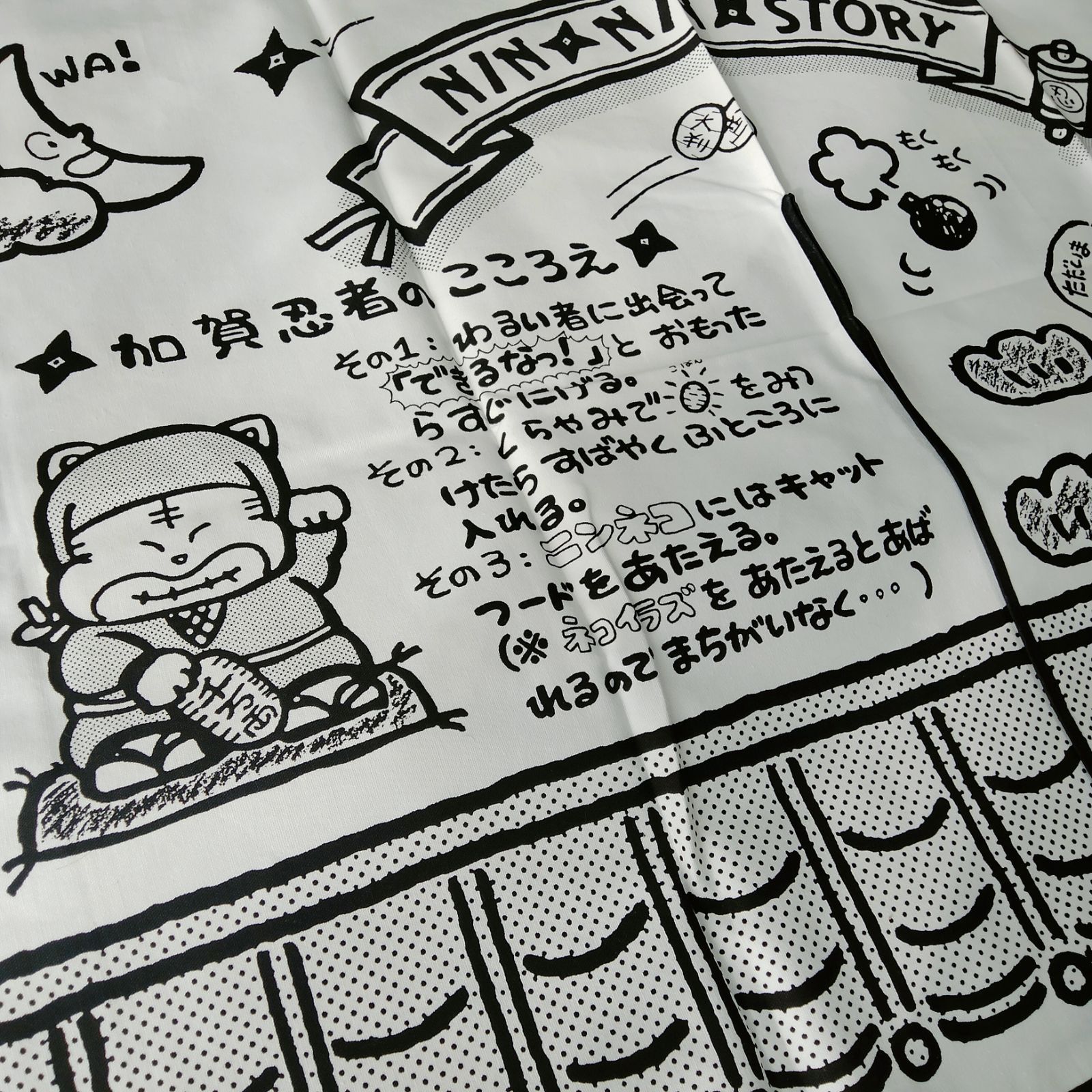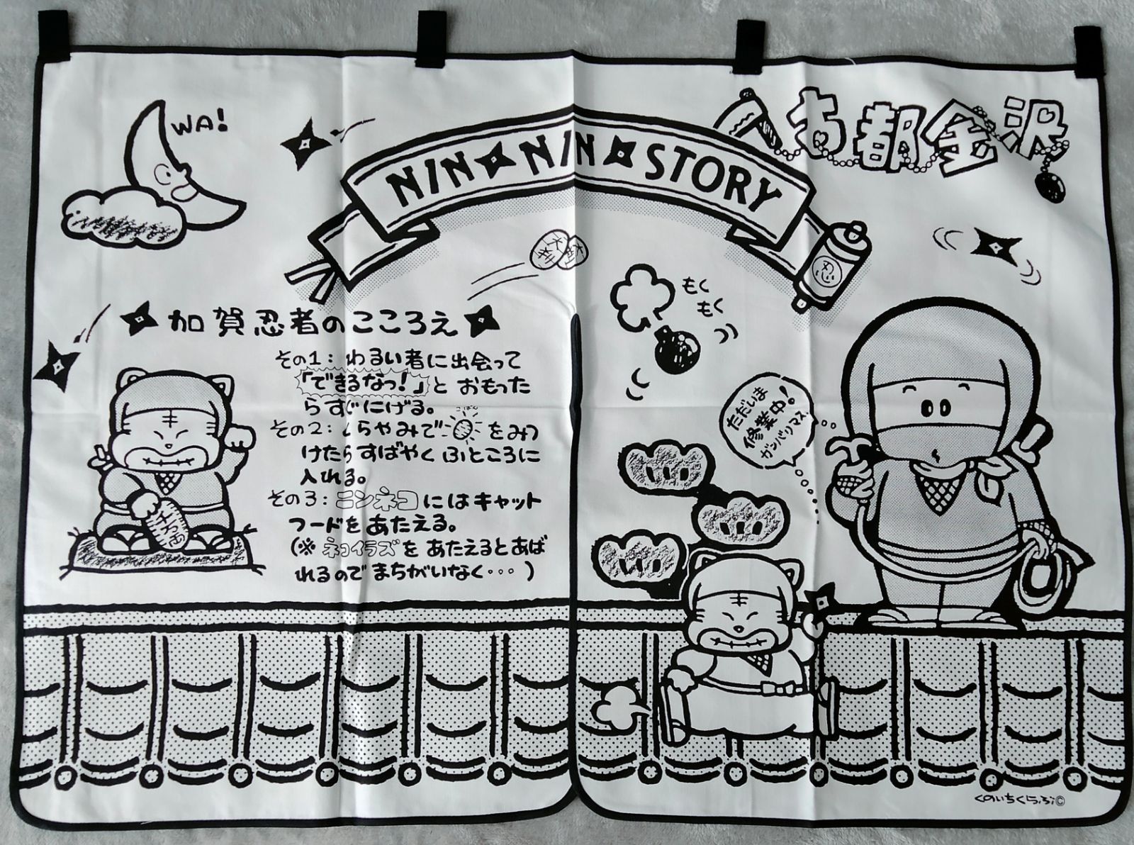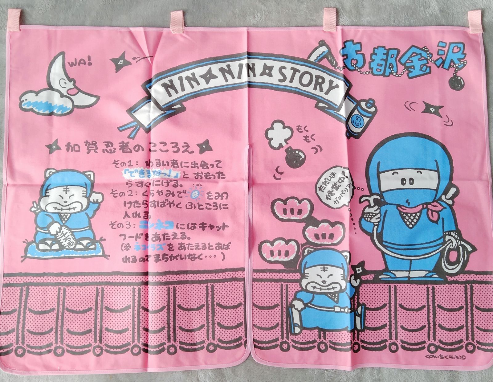加賀忍者が描かれた、ファンシーなのれんです。